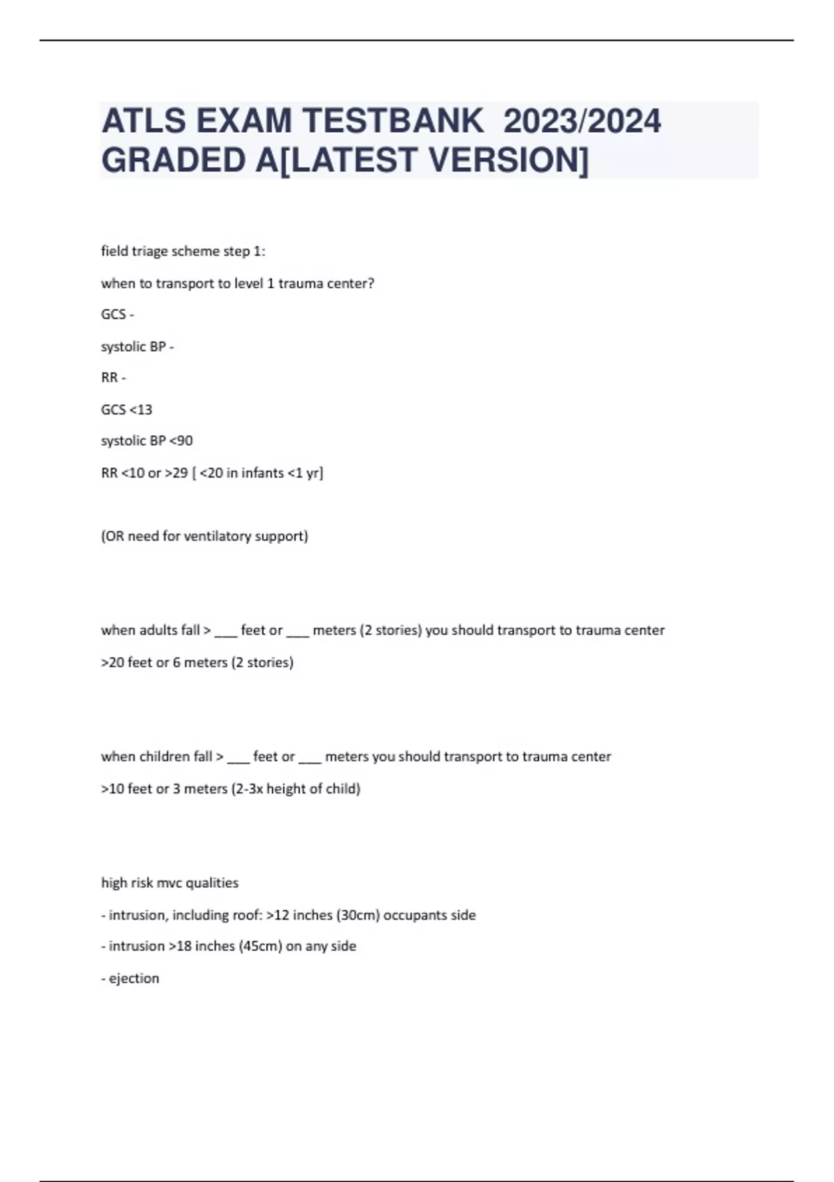 ATLS EXAM TESTBANK 2023/2024 GRADED A[LATEST VERSION] field triage scheme step 1: when to transport to level 1 trauma center? GCS - systolic BP - RR - GCS <13 systolic BP <90 RR <10 or >29 [ <20 in infants <1 yr] (OR need for ventilatory support) when adults fall > ___ feet or ___ meters (2 stories) you should transport to trauma center >20 feet or 6 meters (2 stories) when children fall > ___ feet or ___ meters you should transport to trauma center >10 feet or 3 meters (2-3x height of child) high risk mvc qualities - intrusion, including roof: >12 inches (30cm) occupants side - intrusion >18 inches (45cm) on any side - ejection - death in same passenger compartment - vehicle telemetry data consistent with high risk of injury - auto vs pedestrian/bicyclist thrown, run over or with significant (>20mph) impact - motorcycle crash >20mph define multiple casualty incident multiple casualty incidents are those in which the number of patients and the severity of their injuries do not exceed the capability of the facility to render care. In such cases, patients with life-threatening problems and those sustaining multiple-system injuries are treated first. define mass casualty incident In mass-casualty events, the number of patients and the severity of their injuries does exceed the capability of the facility and staff. In such cases, patients having the greatest chance of survival and requiring the least expenditure of time, equipment, supplies, and personnel are treated first Where can you assess a central pulse? Femoral or carotid artery. Make sure you assess bilaterally for quality, rate and regularity. tourniquets are effective in