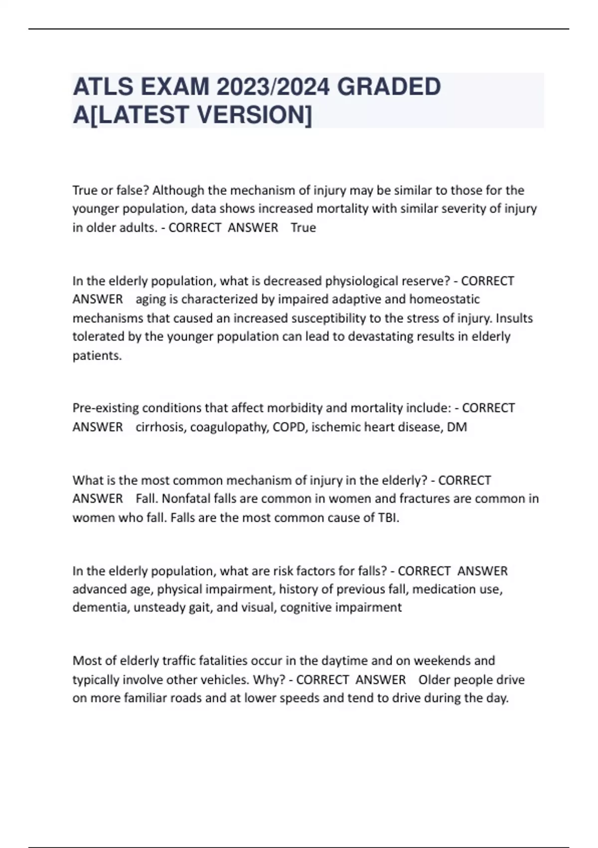 ATLS EXAM 2023/2024 GRADED A[LATEST VERSION] True or false? Although the mechanism of injury may be similar to those for the younger population, data shows increased mortality with similar severity of injury in older adults. - CORRECT ANSWER True In the elderly population, what is decreased physiological reserve? - CORRECT ANSWER aging is characterized by impaired adaptive and homeostatic mechanisms that caused an increased susceptibility to the stress of injury. Insults tolerated by the younger population can lead to devastating results in elderly patients. Pre-existing conditions that affect morbidity and mortality include: - CORRECT ANSWER cirrhosis, coagulopathy, COPD, ischemic heart disease, DM What is the most common mechanism of injury in the elderly? - CORRECT ANSWER Fall. Nonfatal falls are common in women and fractures are common in women who fall. Falls are the most common cause of TBI. In the elderly population, what are risk factors for falls? - CORRECT ANSWER advanced age, physical impairment, history of previous fall, medication use, dementia, unsteady gait, and visual, cognitive impairment Most of elderly traffic fatalities occur in the daytime and on weekends and typically involve other vehicles. Why? - CORRECT ANSWER Older people drive on more familiar roads and at lower speeds and tend to drive during the day. Older people have slower reaction time, a larger blind spot, limited cervical mobility, decreased hearing, and cognitive impairment. True or False? Mortality associated with small to moderate sized burns in older adults remains high - CORRECT ANSWER True Spilled hot liquids on the leg, which in younger patients may re-epithelialize due to an adequate number of hair follicles, will result in a full thickness burn in older patients. - CORRECT ANSWER this is true Airway-patients may have dentures that may loosen or obstruct the airway. If dentures are not obstructing the airway, leave them in place for what? - CORRECT ANSWER bag mask ventilation, as it improves mask fitting. When preforming rapid sequence intubation, the dose of benzos, barbiturates, and other sedatives should be reduced to what percentage to minimize the risk of cardiovascular depression? - CORRECT ANSWER 20-40% Functional changes in cardiac system include declini