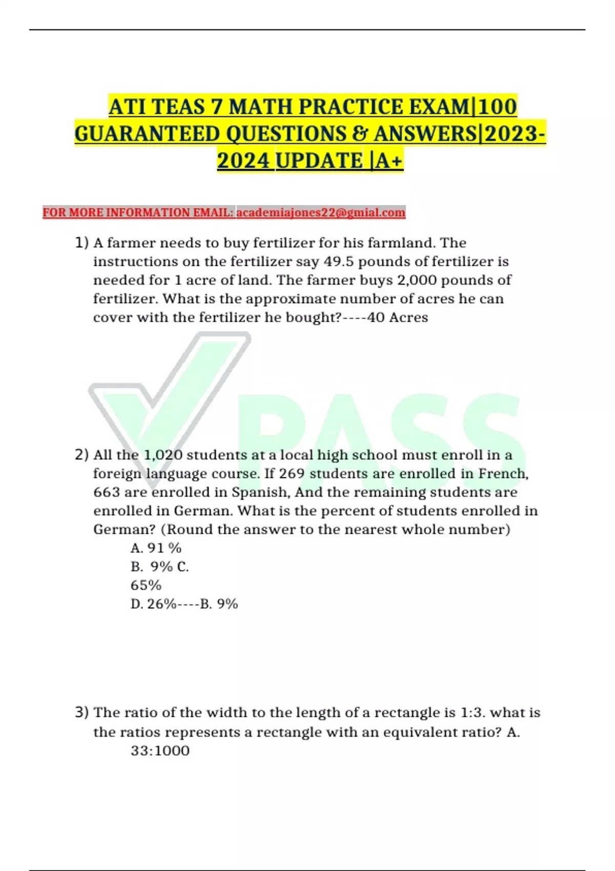 ATI TEAS 7 MATH PRACTICE EXAM|100 GUARANTEED QUESTIONS & ANSWERS| UPDATE |A+