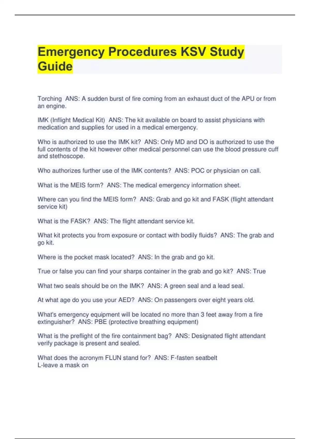 Emergency Procedures KSV Study Guide Torching ANS: A sudden burst of fire coming from an exhaust duct of the APU or from an engine. IMK (Inflight Medical Kit) ANS: The kit available on board to assist physicians with medication and supplies for used in a medical emergency. Who is authorized to use the IMK kit? ANS: Only MD and DO is authorized to use the full contents of the kit however other medical personnel can use the blood pressure cuff and stethoscope. Who authorizes further use of the IMK contents? ANS: POC or physician on call. What is the MEIS form? ANS: The medical emergency information sheet. Where can you find the MEIS form? ANS: Grab and go kit and FASK (flight attendant service kit) What is the FASK? ANS: The flight attendant service kit. What kit protects you from exposure or contact with bodily fluids? ANS: The grab and go kit. Where is the pocket mask located? ANS: In the grab and go kit. True or false you can find your sharps container in the grab and go kit? ANS: True What two seals should be on the IMK? ANS: A green seal and a lead seal. At what age do you use your AED? ANS: On passengers over eight years old. What's emergency equipment will be located no more than 3 feet away from a fire extinguisher? ANS: PBE (protective breathing equipment) What is the preflight of the fire containment bag? ANS: Designated flight attendant verify package is present and sealed. What does the acronym FLUN stand for? ANS: F-fasten seatbelt L-leave a mask on U-use a mask properly N-no smoking What is an early sign of slow decompression? ANS: Ear pain or oxygen mask drop from PSU. If torching is observed who do you notify? ANS: Captain If an air leak is present in the PAX entry door what are the appropriate procedures? ANS: Notify captain, move passengers from the area, do not attempt to stuff or plug. Move flight attendant seat to cabin nearest to assigned door if passenger seat is available. If no more pax available sit at assigned jump-seat and notify captain. What are the three elements of fire? ANS: Oxygen, Heat and combustible materials. What type of fire extinguisher must be used to fight a class A fire? ANS: H2O fire extinguisher Halon/HAFEX What type of fire extinguisher must be used to fight a class B fire? ANS: Halon/HAFEX What type of fire extinguisher must be used to fight a class C fire? ANS: Halon/HAFEX An electrical fire is an example of what class of fire? ANS: Class C When should you use a fire containment bag? ANS: When dealing with a high energy battery. What is hypoxia? ANS: lack of oxygen What are some symptoms of hypoxia? ANS: Impaired motor skills, ear pain, numbness and tingling, mental confusion, fatigue dizziness and headache. What is a flight attendants first priority during decompression? ANS: Take supplement oxygen. In an un-authorized evacuation what must a flight attendant do? ANS: Flight attendants must quickly establish and maintain control, flight attendants must notify flight deck crew, flight attendants must use commands such as "remain seated stay calm". True or false if all exits are jammed there might be a pressurization issue? ANS: True What are some signs that an evacuation may be necessary? ANS: Unusual noises, impact forces, fire or smoke, abnormal aircraft attitude. Which of the following is not a category of turbulence? ANS: Rapid. What does the acronyms ABC stand for? ANS: A-activity monitor and assess potential for error. B-balance available barriers to avoid and trap errors. C-communicate threats and intentions. What is SMS? ANS: A safety management system is a formal top down organization wide approach to management safety risk and assure the effectiveness of safety risk controls. What is CRM? ANS: Crew resource management promotes safe operations and overall crew performance through the optimum use of available resources including but not limited to people, procedures and equipment. What are some examples of crew resource management or CRM? ANS: People, procedures, and equipment. What is TEM? ANS: Threat an error management is the promotion of safe operations through the continuous process of identifying avoiding and manage an operational threats and human errors. What is the ancillary (ANC) ? ANS: Teal colored zipped bag containing additional equipment to protect from suspected communicable diseases. Should only be used if directed by the physician on call (POC) What kit do you use for communicable diseases? ANS: Ancillary kit Where are adhesive bandages located? ANS: In the FASK or first aid kit. When should we use a CDW or cabin discrepancy work sheet? ANS: To report used, inoperative, damaged or missing equipment and smoke/odor/fume (SOF) events to the flight deck. What are the four categories of emergency equipment? ANS: Medical, oxygen, fire fighting, survival Firefighting equipment are consists of what two items? ANS: PBE and fire extinguishers What does the acronym PBE stand for? ANS: Protective Breathing Equipment What are the two types of oxygen equipment? ANS: 66 N. and go to walk around (large and small) What are the two types of situations where oxygen might be used? ANS: In a medical emergency or decompression. What is the AED used for? ANS: Cardiac arrest What color is the crew life vest? ANS: Orange When would you use the megaphone? ANS: In a planned emergency if the intercom is out. Who can an AED be used on? ANS: Passengers eight years and older Where can you find the CDW or cabin discrepancy work sheet? ANS: In the FASK or flight attendant service kit What is the preflight for the ancillary kit? ANS: Verify it's presence, sealed and secured What is the preflight for the AED? ANS: Verify it's presence, Green blinking light and a green or yellow seal. What does ELT stand for? ANS: Emergency Locator Transmitter What two items must a flight attendants have at their jumpseat? ANS: A compact or classic flashlight and a crew life vest. Where can you find iodine wipes? ANS: In the first aid kit Halons/HAFEX are used for what 