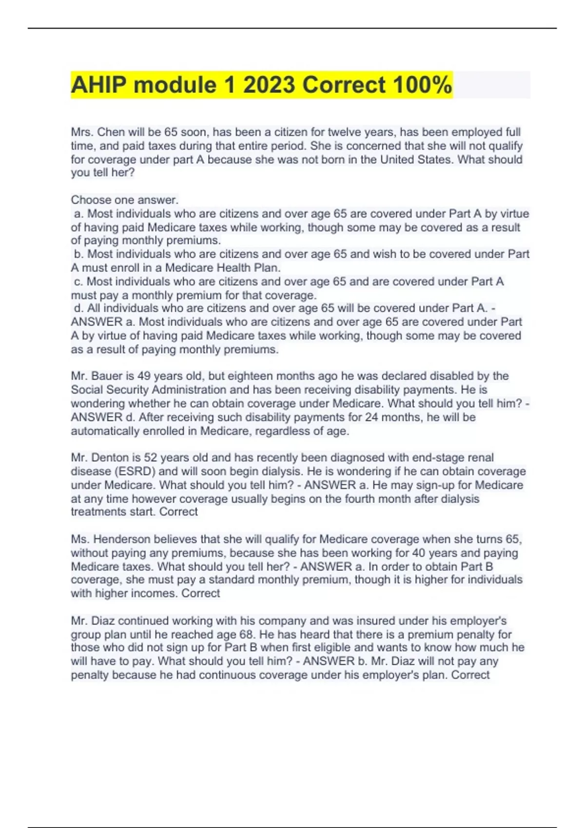 Mrs. Chen will be 65 soon, has been a citizen for twelve years, has been employed full time, and paid taxes during that entire period. She is concerned that she will not qualify for coverage under part A because she was not born in the United States. What should you tell her? Choose one answer. a. Most individuals who are citizens and over age 65 are covered under Part A by virtue of having paid Medicare taxes while working, though some may be covered as a result of paying monthly premiums. b. Most individuals who are citizens and over age 65 and wish to be covered under Part A must enroll in a Medicare Health Plan. c. Most individuals who are citizens and over age 65 and are covered under Part A must pay a monthly premium for that coverage. d. All individuals who are citizens and over age 65 will be covered under Part A. - ANSWER a. Most individuals who are citizens and over age 65 are covered under Part A by virtue of having paid Medicare taxes while working, though some may be covered as a result of paying monthly premiums. Mr. Bauer is 49 years old, but eighteen months ago he was declared disabled by the Social Security Administration and has been receiving disability payments. He is wondering whether he can obtain coverage under Medicare. What should you tell him? - ANSWER d. After receiving such disability payments for 24 months, he will be automatically enrolled in Medicare, regardless