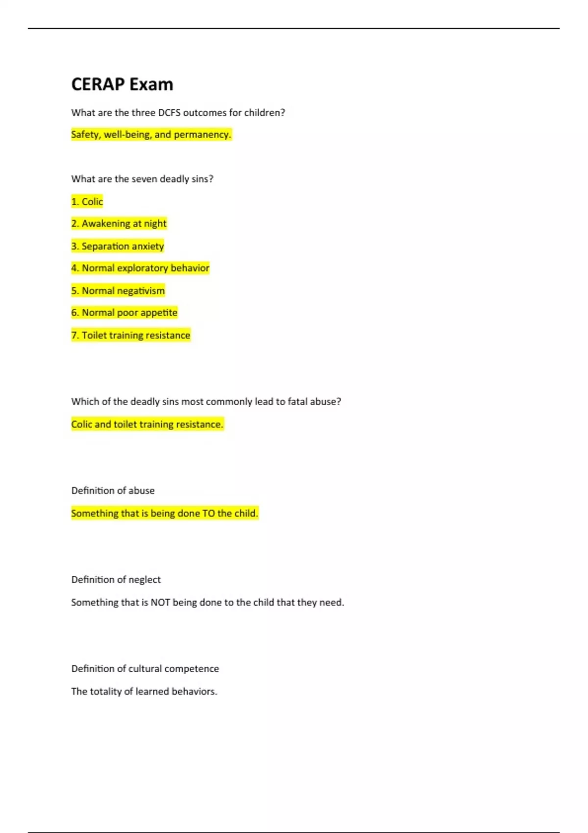 What are the three DCFS outcomes for children? Safety, well-being, and permanency. What are the seven deadly sins? 1. Colic 2. Awakening at night 3. Separation anxiety 4. Normal exploratory behavior 5. Normal negativism 6. Normal poor appetite 7. Toilet training resistance Which of the deadly sins most commonly lead to fatal abuse? Colic and toilet training resistance.