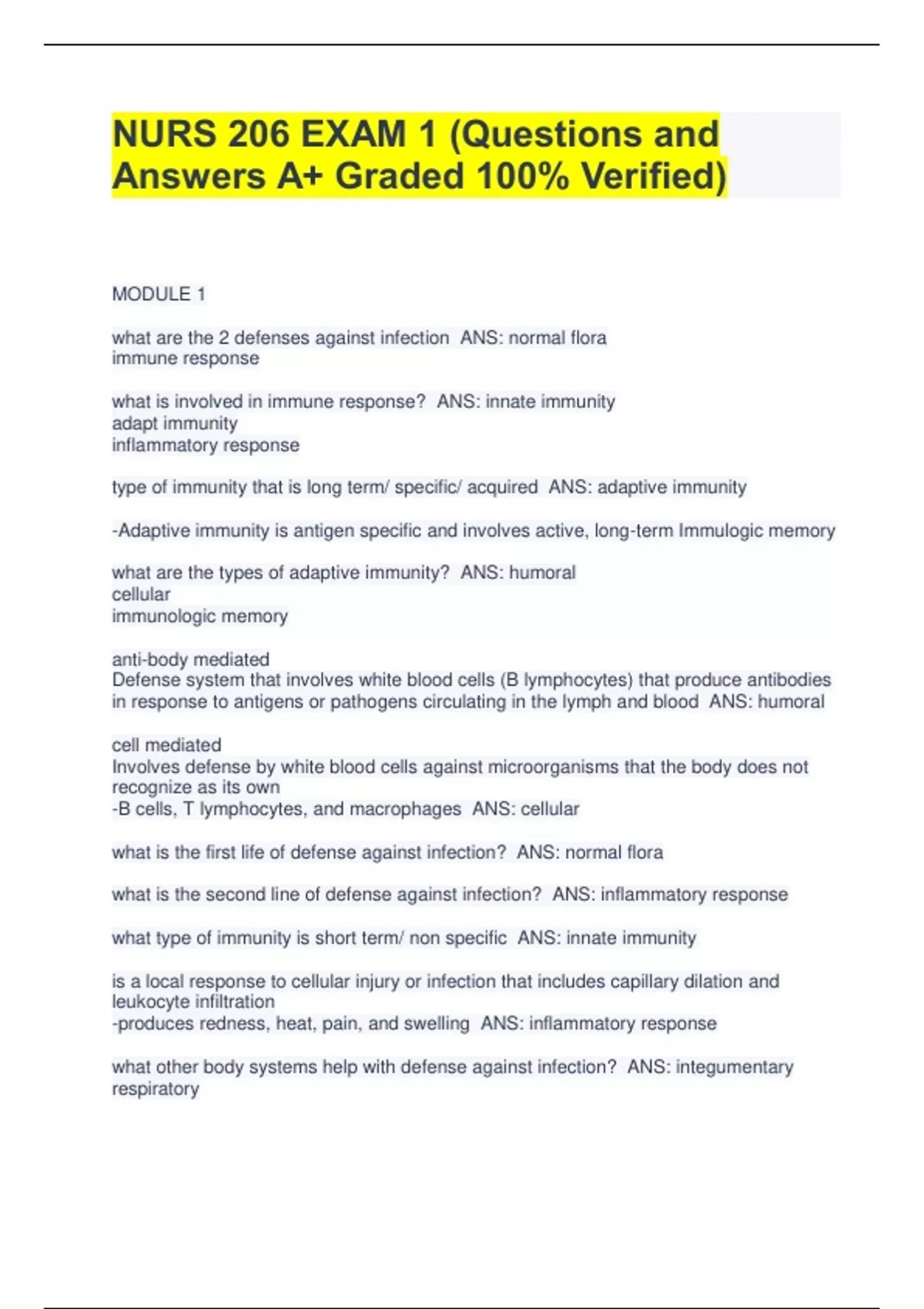 NURS 206 EXAM 1 (Questions and Answers A+ Graded 100% Verified) MODULE 1 what are the 2 defenses against infection ANS: normal flora immune response what is involved in immune response? ANS: innate immunity adapt immunity inflammatory response type of immunity that is long term/ specific/ acquired ANS: adaptive immunity -Adaptive immunity is antigen specific and involves active, long-term Immulogic memory what are the types of adaptive immunity? ANS: humoral cellular immunologic memory anti-body mediated Defense system that involves white blood cells (B lymphocytes) that produce antibodies in response to antigens or pathogens circulating in the lymph and blood ANS: humoral cell mediated Involves defense by white blood cells against microorganisms that the body does not recognize as its own -B cells, T lymphocytes, and macrophages ANS: cellular what is the first life of defense against infection? ANS: normal flora what is the second line of defense against infection? ANS: inflammatory response what type of immunity is short term/ non specific ANS: innate immunity is a local response to cellular injury or infection that includes capillary dilation and leukocyte infiltration -produces redness, heat, pain, and swelling ANS: inflammatory response what other body systems help with defense against infection? ANS: integumentary respiratory gastrointestinal What is the path for the chain of infection? ANS: infectious agent source/ reservoir portal of exit mode of transmission portal of entry susceptible host what are some different types of infectious agents? ANS: bacteria virus parasite fungus what is infection? ANS: the invasion of a host/ patient by a microorganism what needs to happen in order for a microorganism to produce disease? ANS: the organism needs to multiply and alter normal tissue function risk of infectious agent causing disease depends upon: ANS: -the number or organisms -virulence of organisms -ability of organism to enter and survive in the host -susceptibility of the host/ patient susceptibility of the host depends upon: ANS: -age -nutritional status -presence of chronic disease -trauma -smoking where the organism survives and multiples and is the holding area ANS: source/ reservoir examples of sources/ reservoirs ANS: -animal/ insect -intimate object (hospital equipment or food/water? -human being (can be symptomatic or asymptomatic- carry disease but no active sign of disease) what characteristics promote growth of an organism at the source? ANS: -food (undigested) -O2 -water (moist) -temperature (cold prevents growth, so warm) -pH (5.0-7.0) -light (dark) after an organism grows and multiplies it needs a way to exit the reservoir and enter the host, this is called... ANS: the portal of exit what are the different portals of exit? ANS: respiratory tract GI tract GU tract blood skin/mucous surface reproductive tratt transplacental how the organism transports from source to susceptible host ANS: mode of transmission types of transmission ANS: direct -direct contact with organism -sexual contact, airborne, enteric, droplet indirect -organism is transported another way -vector. insect contaminated equipment -contaminated food. (food poisoning or water -can be more than one Mode where an organism enters through the same route as the portal of exit ANS: PORTAL OF ENTRY GI tract -foodborne illness GU tract -wiping back to front respiratory tract -droplets from a sneeze mucous membrane blood -needles/ IV non intact skin -open wound reproductive tract -multiple sexual partners transplancental what is it called when a patient is not able to resist the bombardment of large numbers of organisms ANS: susceptible host things that make people considered susceptible hosts... ANS: infants and elderly immonosuppressed trauma surgery chronic disease poor nutrition smoking multiple drug resistant organism different medication can weaken immune systems what it the ecology/ cause of multiple drug resistant organisms ANS: inappropriate use of antibiotics causes bacteria to be resistant to antibiotics that once worked formerly referred to as nosocomial infections, are infections acquired while the patient is receiving treatment in a health care facility -Associated with the use of medical devices, complication, contagious transmission, and the overuse of antibiotics ANS: health-care associated infections -microorganism developing resistance to medication -A microorganism is considered resistant if replication cannot be stopped by 2 or more antibiotics simultaneously or sequentially -Contributing factors: overprescribing of antibiotics for nonbacterial infections, incomplete course of antibiotics ANS: resistant organisms Can put patients and health care providers at risk Ex. Hep B virus, Hep C virus, HIV Exposure occurs through contact with contaminated blood or body fluid ANS: blood borne pathogens signs and symptoms of an infection depend on... ANS: the type and location of the infection -can be localized (one body part/ system) or systemic (bloodstream) -different diversity considerations as well what are the steps of the nursing process? ANS: ASSESS DIAGNOS PLANNING INTERVENTION EVALUATION assessment when in comes to infection control... what is performed/ assessed? ANS: perform an interview -comprehensive health history -patients clinical experience -exceptions -clusters of defining characteristics what kinds of things are assessed in a comprehensive health history for infection control? ANS: -history of illnesses/ treatment? -open areas on skin -recent invasive diagnostic testing -pain with urination -medication they are taking -history of fever -travel *assess for clues/factors that increase susceptibility in localized infection... what should a nurse do? ANS: -wear exam gloves -assess the affected area for: redness, edema (swelling), exudate(drainage), pain/tenderness, and restriction in movement of body part in a systemic infection what signs/ symptoms could the patient have? ANS: fever fati