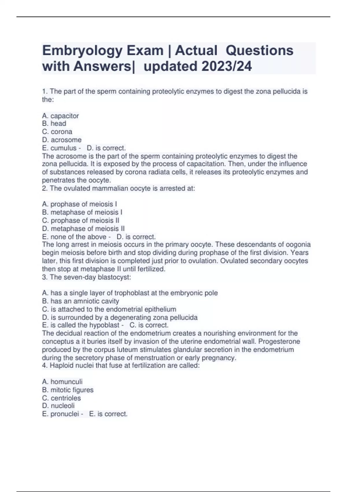 Embryology Exam | Actual Questions with Answers| updated 2023/24 1. The part of the sperm containing proteolytic enzymes to digest the zona pellucida is the: A. capacitor B. head C. corona D. acrosome E. cumulus - D. is correct. The acrosome is the part of the sperm containing proteolytic enzymes to digest the zona pellucida. It is exposed by the process of capacitation. Then, under the influence of substances released by corona radiata cells, it releases its proteolytic enzymes and penetrates the oocyte. 2. The ovulated mammalian oocyte is arrested at: A. prophase of meiosis I B. metaphase of meiosis I C. prophase of meiosis II D. metaphase of meiosis II E. none of the above - D. is correct. The long arrest in meiosis occurs in the primary oocyte. These descendants of oogonia begin meiosis before birth and stop dividing during prophase of the first division. Years later, this first division is completed just prior to ovulation. Ovulated secondary oocytes then stop at metaphase II until fertilized. 3. The seven-day blastocyst: A. has a single layer of trophoblast at the embryonic pole B. has an amniotic cavity C. is attached to the endometrial epithelium D. is surrounded by a degenerating zona pellucida E. is called the hypoblast - C. is correct. The decidual reaction of the endometrium creates a nourishing environment for the conceptus a it buries itself by invasion of the uterine endometrial wall. Progesterone produced by the corpus luteum stimulates glandular secretion in the endometrium during the secretory phase of menstruation or early pregnancy. 4. Haploid nuclei that fuse at fertilization are called: A. homunculi B. mitotic figures C. centrioles D. nucleoli E. pronuclei - E. is correct. After the sperm reaches the ovum, it deposits its genetic load, the male pronucleus, into the cytoplasm of the egg. After finally completing the meiotic division that had begun years before, the female pronucleus fuses with the male pronucleus to create the diploid nucleus of the zygote 5. The first week of human development is characterized by formation of the: A. inner cell mass B. hypoblast C. trophoblast D. blastocyst E. all of the above - E. is correct. At four days, the blastocyst cavity of blastocele forms within the morula. Trophoblast are outer cells of the blastocyst, while a knot of cells appears, protruding into the blastocele. This is the inner cell mass. Trophoblast becomes 2 layers: syncytiotrophoblast and cytotrophoblast. Inner cell mass becomes epiblast and hypoblast. 6. During implantation, the blastocyst: A. implants in the endometrium B. usually attaches to endometrial epithelium at its embryonic pole C. usually implants in the posterior wall of the body of the uterus D. causes change in the endometrial tissues E. all of the above are correct - E. is correct. Implantation occurs when the trophoblast cells at the embryonic pole secrete proteolytic enzymes that allow the blastocyst to penetrate the wall of the uterus, usually the posterior wall. The endometrial lining responds to implantation through the decidua reaction, by which it becomes more succulent for nourishing the blastocyst. 7. Capacitation of the sperm: A. is caused by the zona pellucida B. occurs in the male C. prevents polyspermy D. is essential for fertilization E. removes the head of the sperm - D. is correct. Capacitation involves removing the glycoprotein coat and seminal plasma proteins from the head of the sperm, exposing the acrosome and allowing the acrosome reaction to occur. Capacitation occurs within the female genital tract, and without its occurrence, fertilization could not occur. 8. The early stages of cleavage are characterized by: A. formation of a hollow ball of cells B. formation of the zona pellucida C. increase in the size of the cells in the zygote D. increase in the number of cells in the zygote E. none of the above - D. is correct. The earliest stages of cleavage are marked by a series of mitotic divisions that increase the number of cells in the zygote without an increase in size. As the cleavage continues the zygote becomes a morula or a solid ball of 12-16 cels. A cavity forming within the morula transforms it into a blasocyst, at about day 4. 9. The most common site for implantation in ectopic pregnancy is: A. internal os of the uterus B. mesentery C. ovary D. uterine tube E. other - D. is correct. The most common site of ectopic implantation is the uterine tube. The growth of the embryo in this site usually causes rupture of the tube and severe hemorrhage in the mother. Abdominally, an ectopic pregnancy often occurs in the rectouterine pouch, an area between the uterus and the rectum. 10. With the light microscope, the zona pellucida appears as a translucent membrane surrounding the: A. primary oocyte B. zygote C. morula D. very early blastocyst E. all of the above are correct - E. is correct. The zona pellucida persists until early it the blastocyst stage. It dissolves during the blastocyst stage in order that implantation may occur. 11. The amniotic cavity develops: A. on the tenth day B. within the outer cell mass C. within the inner cell mass near the cytotrophoblast D. in extraembryonic mesoderm E. none of the above - C. is correct. The amniotic cavity begins to develop around the 8th ay as a slit-like area within the epiblast near the cytotrophoblast. It usually ha a thin strip of epiblast cells, called amnioblasts, between it and the cytotrophoblast. 12. During the second week of development, the trophoblast differentiates into: A. syncytiotrophoblast B. ectoderm C. intraembryonic mesoderm D. yolk sac (secondary) - A. is correct. The trophoblast gives rise to both the syncytiotrophoblast and the cytotrophoblast, as well as the extraembryonic mesoderm. The ectoderm is a derivative of the epiblast, and the secondary yolk sac comes from endoderm cells that line the exocoelomic cavity or the primitive yolk sac. 13. The first two intraembryonic germ layers to differentiate are the: A.