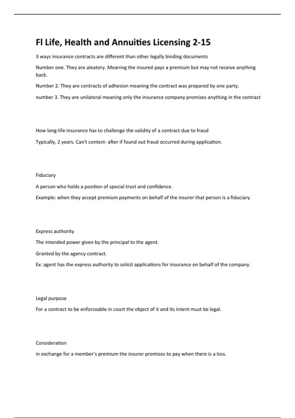 3 ways insurance contracts are different than other legally binding documents Number one. They are aleatory. Meaning the insured pays a premium but may not receive anything back. Number 2. They are contracts of adhesion meaning the contract was prepared by one party. number 3. They are unilateral meaning only the insurance company promises anything in the contract How long-life insurance has to challenge the validity of a contract due to fraud Typically, 2 years. Can't contest- after if found out fraud occurred during application. Fiduciary A person who holds a position of special trust and confidence. Example: when they accept premium payments on behalf of the insurer that person is a fiduciary