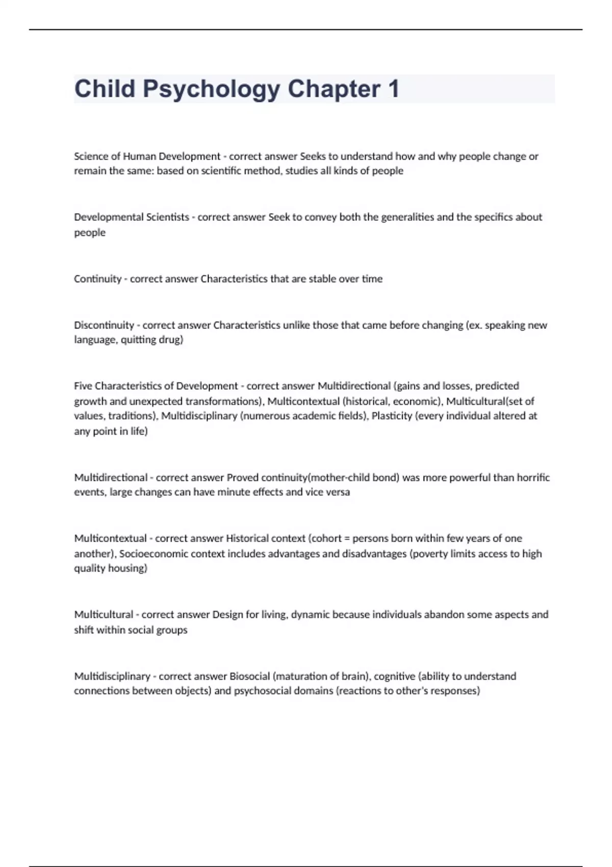 Child Psychology Chapter 1Science of Human Development - correct answer Seeks to understand how and why people change or remain the same: based on scientific method, studies all kinds of people Developmental Scientists - correct answer Seek to convey both the generalities and the specifics about people Continuity - correct answer Characteristics that are stable over time Discontinuity - correct answer Characteristics unlike those that came before changing (ex. speaking new language, quitting drug) Five Characteristics of Development - correct answer Multidirectional (gains and losses, predicted growth and unexpected transformations), Multicontextual (historical, economic), Multicultural(set of values, traditions), Multidisciplinary (numerous academic fields), Plasticity (every individual altered at any point in life) Multidirectional - correct answer Proved continuity(mother-child bond) was more powerful than horrific events, large changes can have minute effects and vice versa Multicontextual - correct answer Historical context (cohort = persons born within few years of one another), Socioeconomic context includes advantages and disadvantages (poverty limits access to high quality housing) Multicultural - correct answer Design for living, dynamic because individuals abandon some aspects and shift within social groups Multidisciplinary - correct answer Biosocial (maturation of brain), cognitive (ability to understand connections between objects) and psychosocial domains (reactions to other's responses)