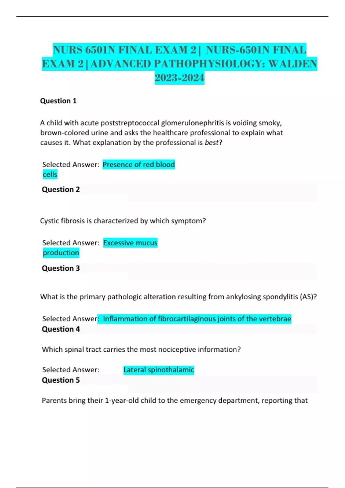 NURS-6501N| NURS6501N|NURS 6501N FINAL EXAM 2| ADVANCED PATHOPHYSIOLOGY: WALDEN | ALL ANSWERS MARKED CORRECT