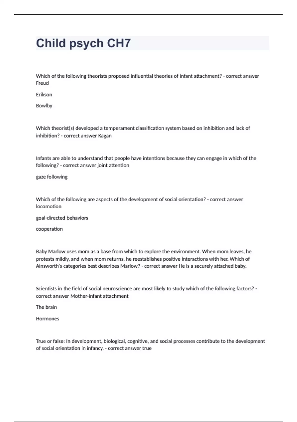 Child psych CH7Which of the following theorists proposed influential theories of infant attachment? - correct answer Freud Erikson Bowlby Which theorist(s) developed a temperament classification system based on inhibition and lack of inhibition? - correct answer Kagan Infants are able to understand that people have intentions because they can engage in which of the following? - correct answer joint attention gaze following Which of the following are aspects of the development of social orientation? - correct answer locomotion goal-directed behaviors cooperation Baby Marlow uses mom as a base from which to explore the environment. When mom leaves, he protests mildly, and when mom returns, he reestablishes positive interactions with her. Which of Ainsworth's categories best describes Marlow? - correct answer He is a securely attached baby. Scientists in the field of social neuroscience are most likely to study which of the following factors? - correct answer Mother-infant attachment The brain Hormones True or false: In development, biological, cognitive, and social processes contribute to the development of social orientation in infancy. - correct answer true