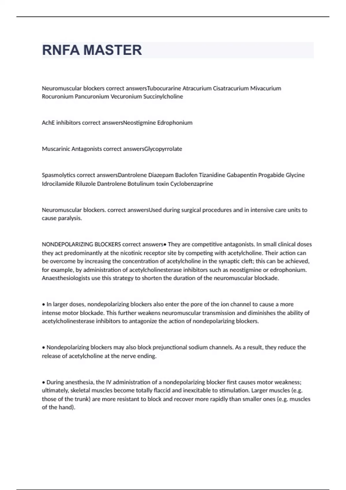 Neuromuscular blockers correct answersTubocurarine Atracurium Cisatracurium Mivacurium Rocuronium Pancuronium Vecuronium Succinylcholine AchE inhibitors correct answersNeostigmine Edrophonium Muscarinic Antagonists correct answersGlycopyrrolate Spasmolytics correct answersDantrolene Diazepam Baclofen Tizanidine Gabapentin Progabide Glycine Idrocilamide Riluzole Dantrolene Botulinum toxin Cyclobenzaprine Neuromuscular blockers. correct answersUsed during surgical procedures and in intensive care units to cause paralysis. NONDEPOLARIZING BLOCKERS correct answers• They are competitive antagonists. In small clinical doses they act predominantly at the nicotinic receptor site by competing with acetylcholine. Their action can be overcome by increasing the concentration of acetylcholine in the synaptic cleft; this can be achieved, for example, by administration of acetylcholinesterase inhibitors such as neostigmine or edrophonium. Anaesthesiologists use this strategy to shorten the duration of the neuromuscular blockade. • In larger doses, nondepolarizing blockers also enter the pore of the ion channel to cause a more intense motor blockade. This further weakens neuromuscular transmission and diminishes the ability of acetylcholinesterase inhibitors to antagonize the action of nondepolarizing blockers. • Nondepolarizing blockers may also block prejunctional sodium channels. As a result, they reduce the release of acetylcholine at the nerve ending. • During anesthesia, the IV administration of a nondepolarizing blocker first causes motor weakness; ultimately, skeletal muscles become totally flaccid and inexcitable to stimulation. Larger muscles (e.g. those of the trunk) are more resistant to block and recover more rapidly than smaller ones (e.g. muscles of the hand).
