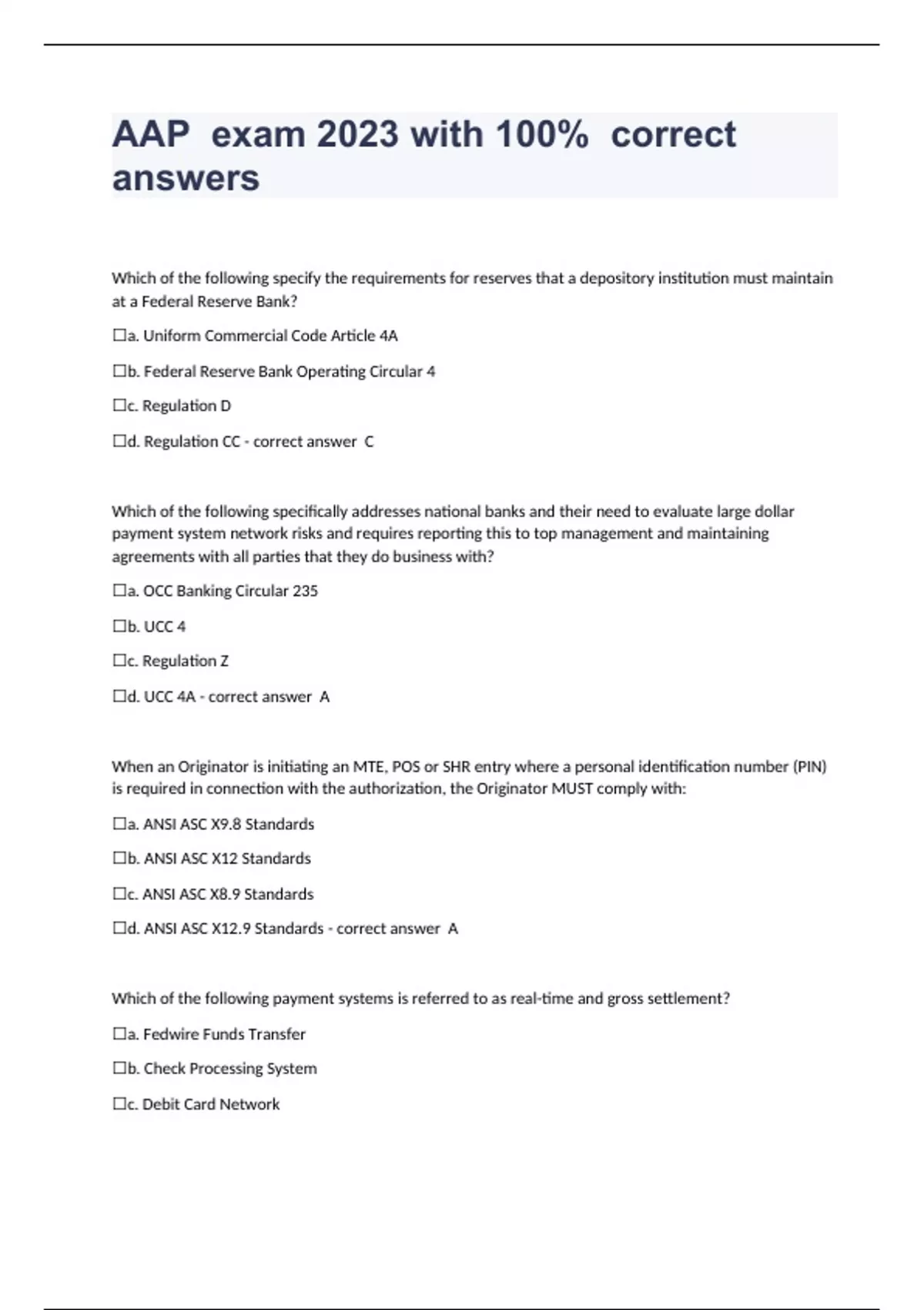 Which of the following specify the requirements for reserves that a depository institution must maintain at a Federal Reserve Bank? a. Uniform Commercial Code Article 4A b. Federal Reserve Bank Operating Circular 4 c. Regulation D d. Regulation CC - correct answer C Which of the following specifically addresses national banks and their need to evaluate large dollar payment system network risks and requires reporting this to top management and maintaining agreements with all parties that they do business with? a. OCC Banking Circular 235 b. UCC 4 c. Regulation Z d. UCC 4A - correct answer A When an Originator is initiating an MTE, POS or SHR entry where a personal identification number (PIN) is required in connection with the authorization, the Originator MUST comply with: a. ANSI ASC X9.8 Standards b. ANSI ASC X12 Standards c. ANSI ASC X8.9 Standards d. ANSI ASC X12.9 Standards - correct answer A Which of the following payment systems is referred to as real-time and gross settlement? a. Fedwire Funds Transfer b. Check Processing System c. Debit Card Network d. ACH Network - correct answer A Choose the correct description of the Acquirer in the card network system: a. The entity that has agreed to accept credit and debit cards for the purchase of goods and services b. The entity that issues a credit or debit card to the card holder c. A financial institution that represents merchants in accepting POS transactions d. The network that provides switching facilities for the card transactions - correct answer C Which of the following lists the participants in the check participants in check processing order? a. Payor/Payee/Receiver/Paying Bank b. Payee/Bank of First Deposit/Correspondent Bank/Paying Bank c. Payor/Payee/Payee's FI/Payor's FI/Correspondent Bank d. Payor/Payee/Merchant/ODFI/RDFI - correct answer B An unauthorized entry is transmitted into the ACH Network by County Credit Union, there are financial losses involved and County Credit Union and the RDFI (State Bank) cannot come to an agreement as who should be paying what amount of money and to whom. What is the minimum amount of dispute BEFORE a complaint can be filed to initiate an arbitration proceeding? a. $200 b. $250 c $1,000 d. $2,500 - correct answer B Blue Sky Bank does ACH origination for two local companies in town. The bank has agreements in place with the two originators in which it provides the necessary disclosures for UCC Article 4A as required by the NACHA
