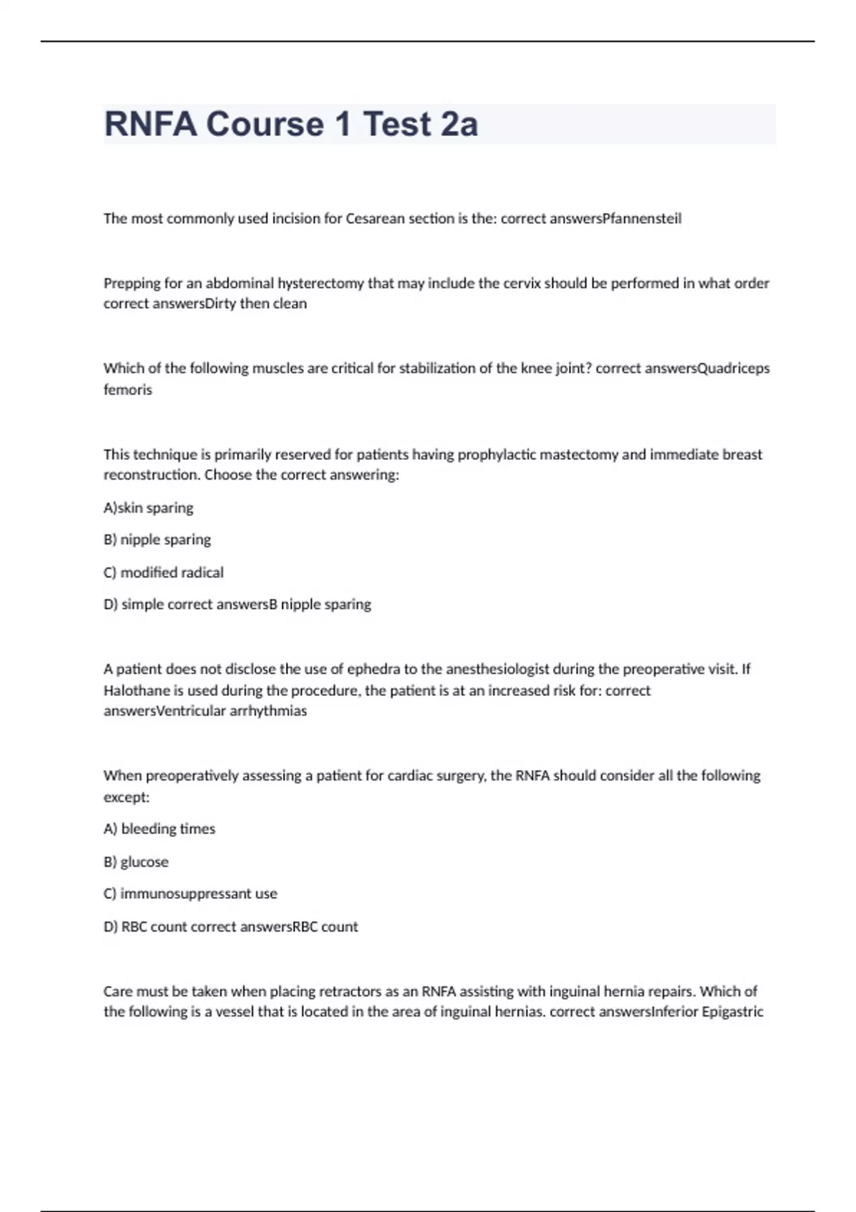 The most commonly used incision for Cesarean section is the: correct answersPfannensteil Prepping for an abdominal hysterectomy that may include the cervix should be performed in what order correct answersDirty then clean Which of the following muscles are critical for stabilization of the knee joint? correct answersQuadriceps femoris This technique is primarily reserved for patients having prophylactic mastectomy and immediate breast reconstruction. Choose the correct answering: A)skin sparing B) nipple sparing C) modified radical D) simple correct answersB nipple sparing A patient does not disclose the use of ephedra to the anesthesiologist during the preoperative visit. If Halothane is used during the procedure, the patient is at an increased risk for: correct answersVentricular arrhythmias When preoperatively assessing a patient for cardiac surgery, the RNFA should consider all the following except: A) bleeding times B) glucose C) immunosuppressant use D) RBC count correct answersRBC count Care must be taken when placing retractors as an RNFA assisting with inguinal hernia repairs. Which of the following is a vessel that is located in the area of inguinal hernias. correct answersInferior Epigastric