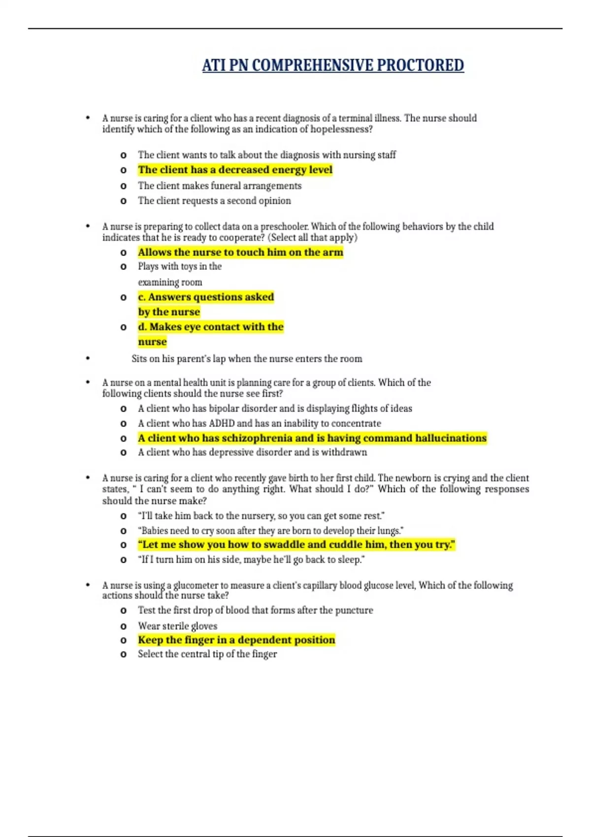 • A nurse is caring for a client who has a recent diagnosis of a terminal illness. The nurse should identify which of the following as an indication of hopelessness? The client has a decreased energy level o The client wants to talk about the diagnosis with nursing staff o o The client makes funeral arrangements o The client requests a second opinion Allows the nurse to touch him on the arm • A nurse is preparing to collect data on a preschooler. Which of the following behaviors by the child indicates that he is ready to cooperate? (Select all that apply) o o Plays with toys in the examining room c. Answers questions asked o by the nurse o d. Makes eye contact with the nurse • Sits on his parent’s lap when the nurse enters the room • A nurse on a mental health unit is planning care for a group of clients. Which of the following clients should the nurse see first? A client who has schizophrenia and is having command hallucinations o A client who has bipolar disorder and is displaying flights of ideas o A client who has ADHD and has an inability to concentrate o o A client who has depressive disorder and is withdrawn • A nurse is caring for a client who recently gave birth to her first child. The newborn is crying and the client states, “ I can’t seem to do anything right. What should I do?” Which of the following responses should the nurse make? “Let me show you how to swaddle and cuddle him, then you try.” o “I’ll take him back to the nursery, so you can get some rest.” o “Babies need to cry soon after they are born to develop their lungs.” o o “If I turn him on his side, maybe he’ll go back to sleep.”