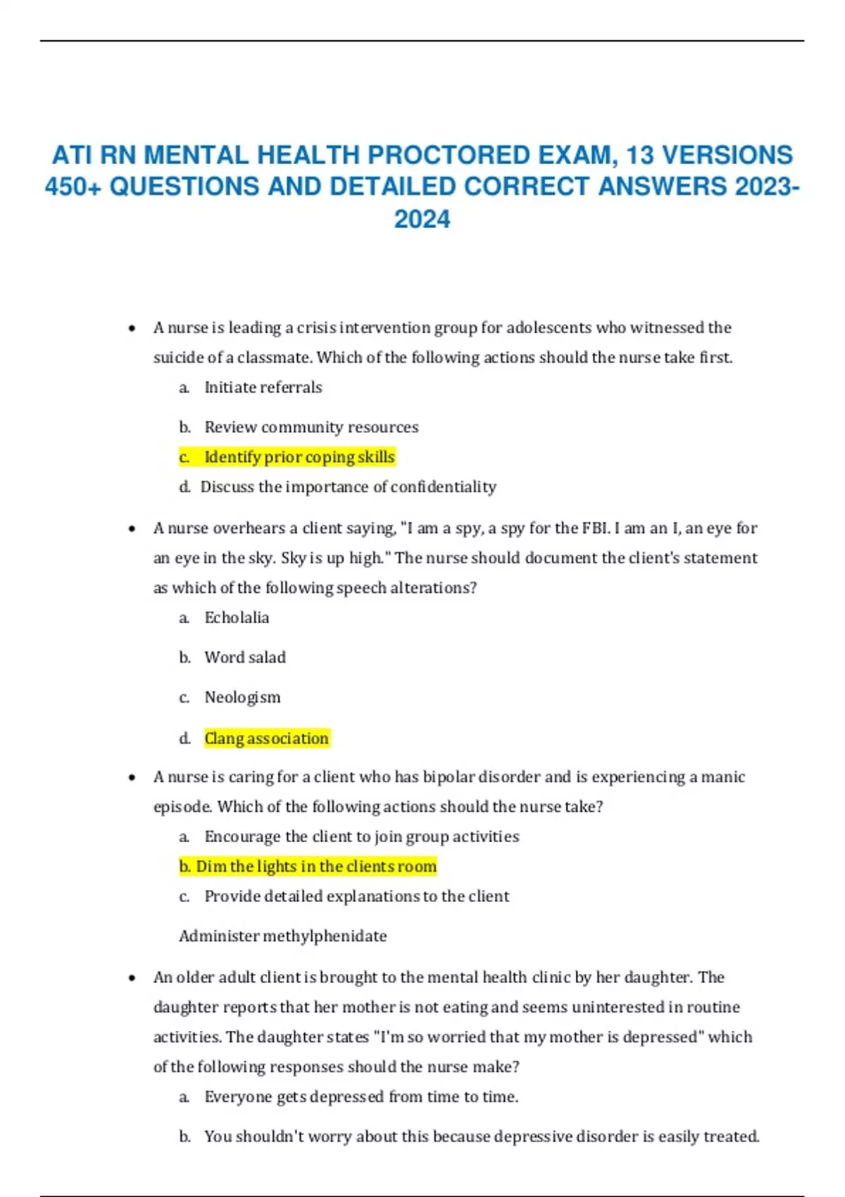 ATI RN MENTAL HEALTH PROCTORED EXAM, 13 VERSIONS 450+ QUESTIONS AND DETAILED ANSWERS
