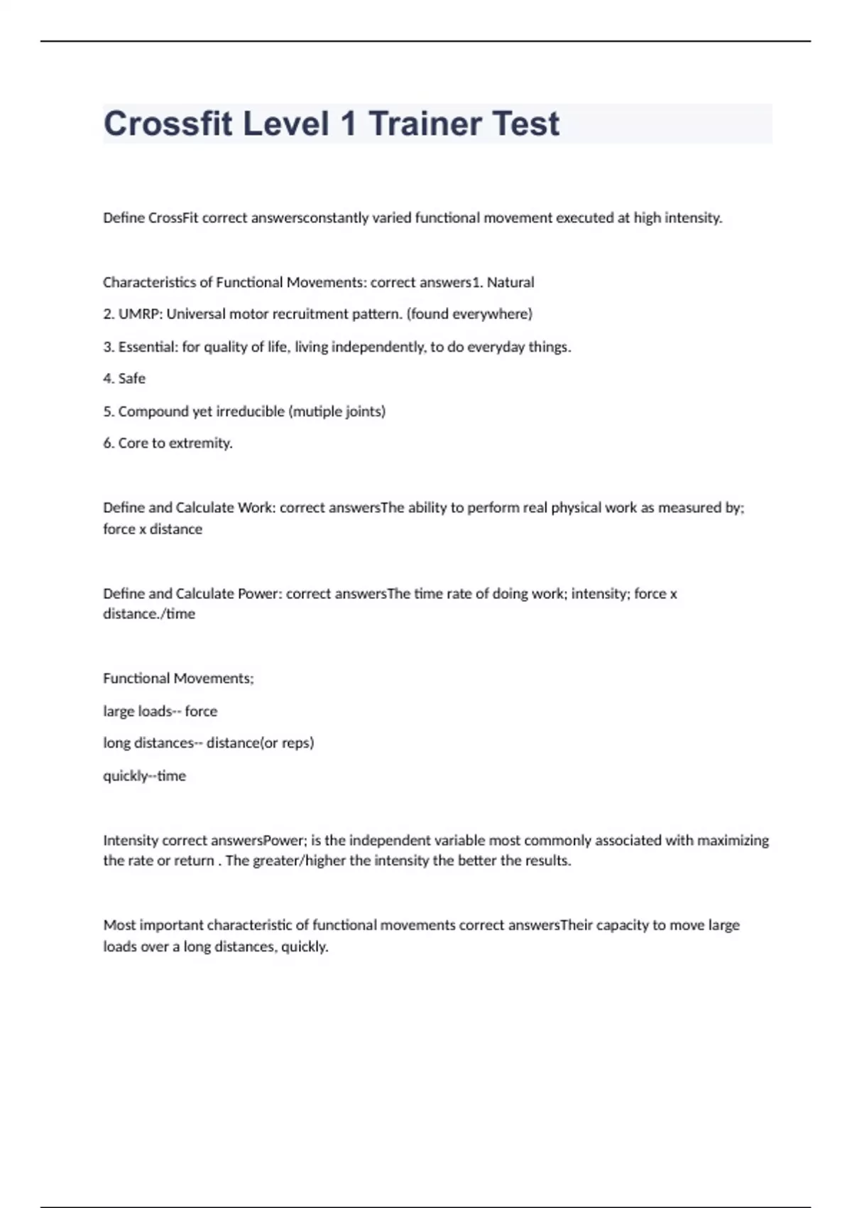 Define CrossFit correct answersconstantly varied functional movement executed at high intensity. Characteristics of Functional Movements: correct answers1. Natural 2. UMRP: Universal motor recruitment pattern. (found everywhere) 3. Essential: for quality of life, living independently, to do everyday things. 4. Safe 5. Compound yet irreducible (mutiple joints) 6. Core to extremity. Define and Calculate Work: correct answersThe ability to perform real physical work as measured by; force x distance Define and Calculate Power: correct answersThe time rate of doing work; intensity; force x distance./time Functional Movements; large loads-- force long distances-- distance(or reps) quickly--time Intensity correct answersPower; is the independent variable most commonly associated with maximizing the rate or return . The greater/higher the intensity the better the results. Most important characteristic of functional movements correct answersTheir capacity to move large loads over a long distances, quickly.
