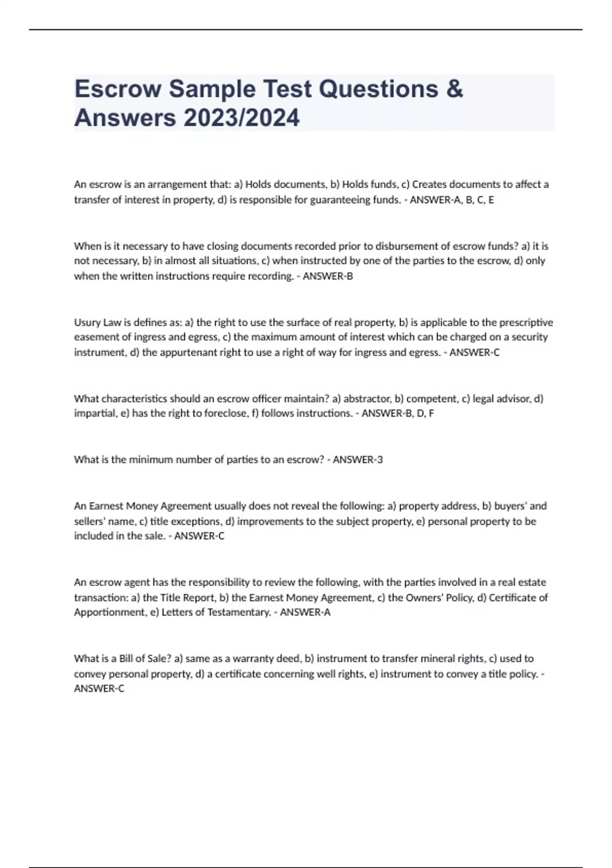Escrow Sample Test Questions & Answers 2023/2024 An escrow is an arrangement that: a) Holds documents, b) Holds funds, c) Creates documents to affect a transfer of interest in property, d) is responsible for guaranteeing funds. - ANSWER-A, B, C, E When is it necessary to have closing documents recorded prior to disbursement of escrow funds? a) it is not necessary, b) in almost all situations, c) when instructed by one of the parties to the escrow, d) only when the written instructions require recording. - ANSWER-B Usury Law is defines as: a) the right to use the surface of real property, b) is applicable to the prescriptive easement of ingress and egress, c) the maximum amount of interest which can be charged on a security instrument, d) the appurtenant right to use a right of way for ingress and egress. - ANSWER-C What characteristics should an escrow officer maintain? a) abstractor, b) competent, c) legal advisor, d) impartial, e) has the right to foreclose, f) follows instructions. - ANSWER-B, D, F What is the minimum number of parties to an escrow? - ANSWER-3 An Earnest Money Agreement usually does not reveal the following: a) property address, b) buyers' and sellers' name, c) title exceptions, d) improvements to the subject property, e) personal property to be included in the sale. - ANSWER-C An escrow agent has the responsibility to review the following, with the parties involved in a real estate transaction: a) the Title Report, b) the Earnest Money Agreement, c) the Owners' Policy, d) Certificate of Apportionment, e) Letters of Testamentary. - ANSWER-A What is a Bill of Sale? a) same as a warranty deed, b) instrument to transfer mineral rights, c) used to convey personal property, d) a certificate concerning well rights, e) instrument to convey a title policy. - ANSWER-C