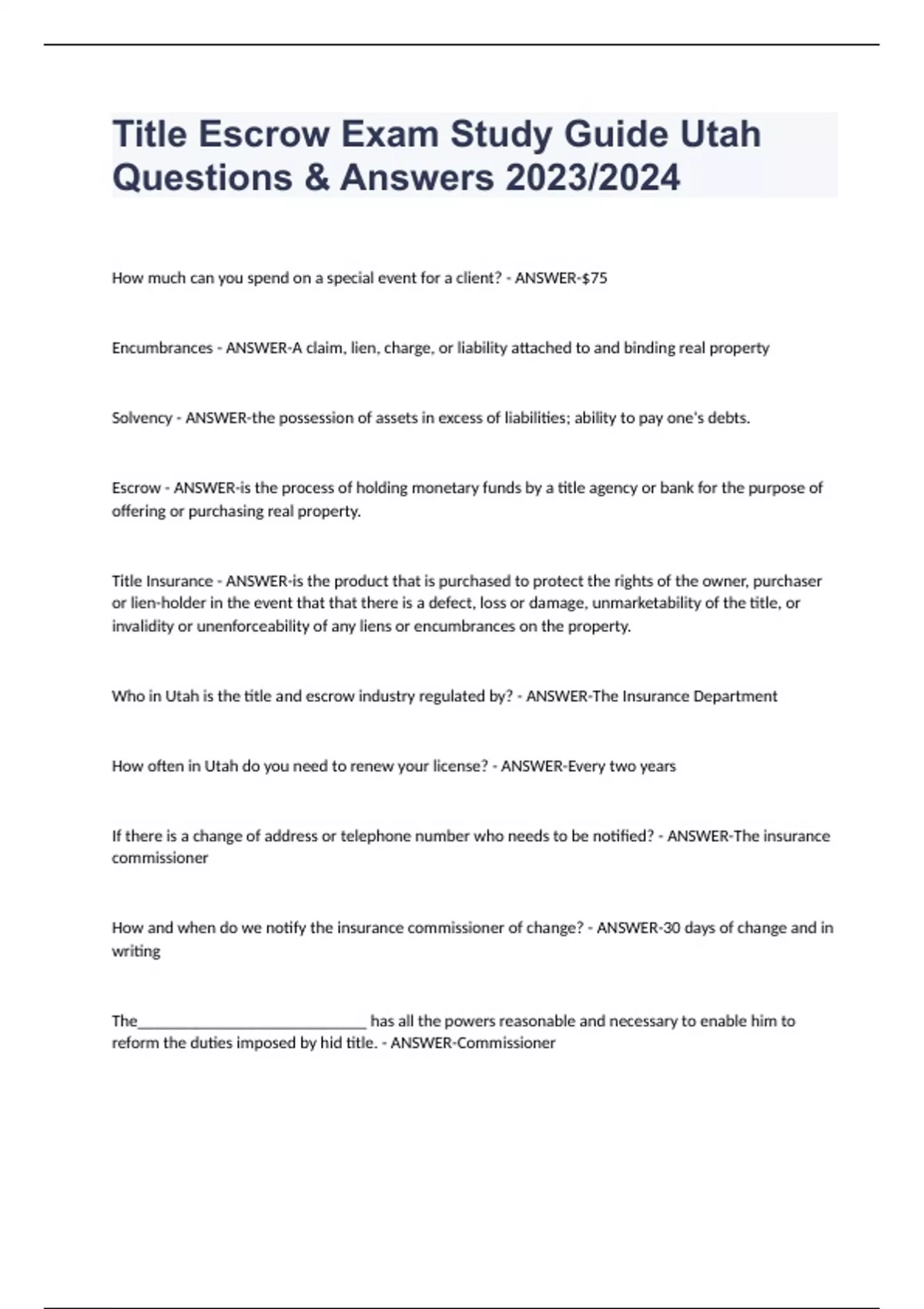 Title Escrow Exam Study Guide Utah Questions & Answers 2023/2024 How much can you spend on a special event for a client? - ANSWER-$75 Encumbrances - ANSWER-A claim, lien, charge, or liability attached to and binding real property Solvency - ANSWER-the possession of assets in excess of liabilities; ability to pay one's debts. Escrow - ANSWER-is the process of holding monetary funds by a title agency or bank for the purpose of offering or purchasing real property. Title Insurance - ANSWER-is the product that is purchased to protect the rights of the owner, purchaser or lien-holder in the event that that there is a defect, loss or damage, unmarketability of the title, or invalidity or unenforceability of any liens or encumbrances on the property. Who in Utah is the title and escrow industry regulated by? - ANSWER-The Insurance Department How often in Utah do you need to renew your license? - ANSWER-Every two years If there is a change of address or telephone number who needs to be notified? - ANSWER-The insurance commissioner How and when do we notify the insurance commissioner of change? - ANSWER-30 days of change and in writing The___________________________ has all the powers reasonable and necessary to enable him to reform the duties imposed by hid title. - ANSWER-Commissioner