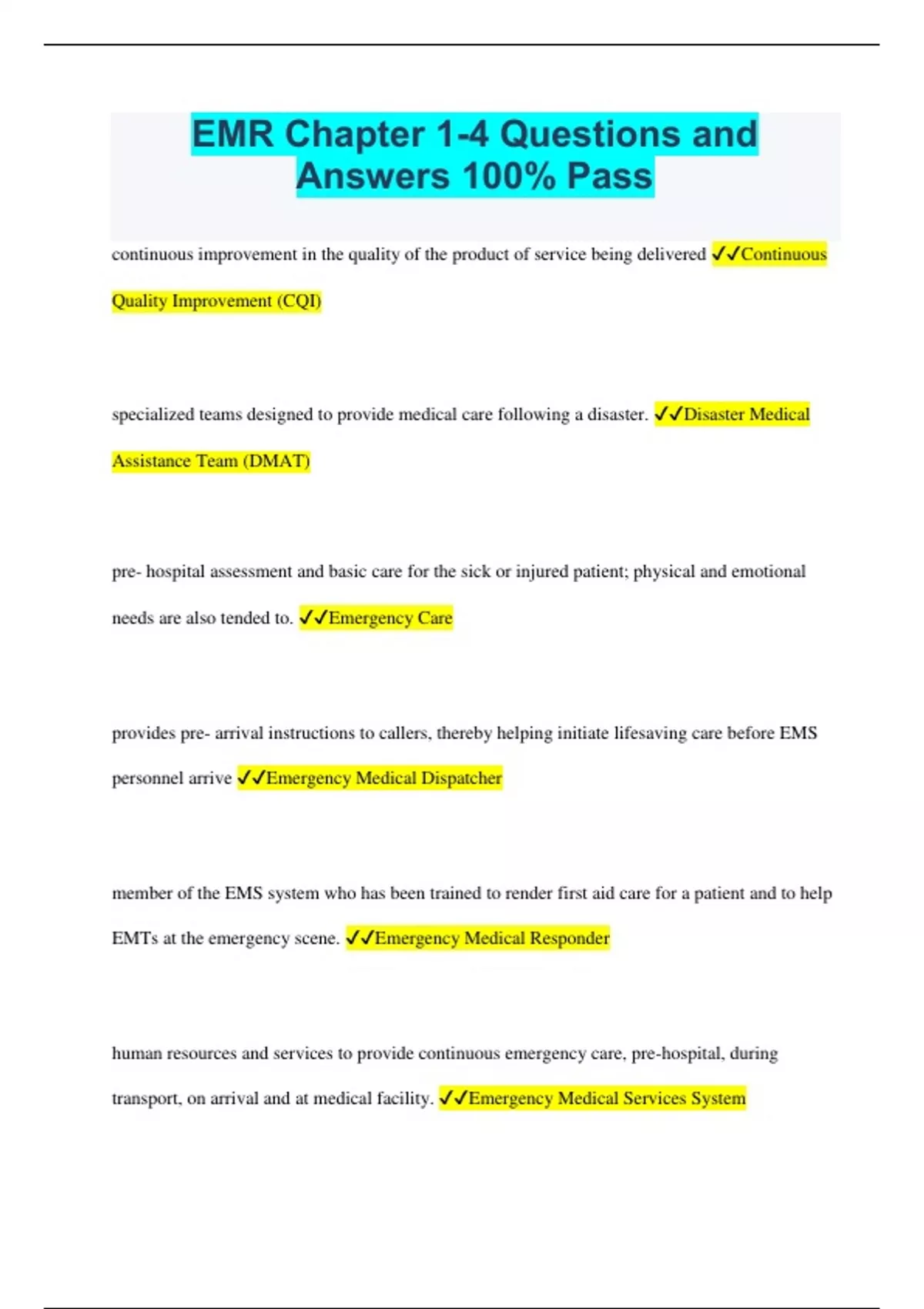 EMR Chapter 1-4 Questions and Answers 100% Pass continuous improvement in the quality of the product of service being delivered Continuous Quality Improvement (CQI) specialized teams designed to provide medical care following a disaster. Disaster Medical Assistance Team (DMAT) pre- hospital assessment and basic care for the sick or injured patient; physical and emotional needs are also tended to. Emergency Care provides pre- arrival instructions to callers, thereby helping initiate lifesaving care before EMS personnel arrive Emergency Medical Dispatcher member of the EMS system who has been trained to render first aid care for a patient and to help EMTs at the emergency scene. Emergency Medical Responder human resources and services to provide continuous emergency care, pre-hospital, during transport, on arrival and at medical facility. Emergency Medical Services System member of EMS system whose training emphasizes assessment, care, transportation. Some may start IV, insert advanced airway, and administer medications Emergency Medical Technician (EMT) medical oversight provided for an EMS system or one of its components by a licensed physician Medical Direction a physician who assumes the ultimate responsibility for medical oversight for patient care aspects of the EMS system. Medical Director education and training standards developed by NHTSA for all levels of EMS training National EMS education standards An EMS systems standing orders and protocols which authorize personnel to perform particular skills in certain situations without speaking to the medical director Off- line medical direction (Indirect Medical Direction) administering care from an on- duty physician given to rescuer in person, over the radio, or over the phone On- Line medical direction (Direct Medical Direction) part of EMS system - advanced life support care , insert endotrachial tube, IV, medications, interpret electrocardiograms, monitor cardiac rhythms,an perform cardiac defibrillation Paramedic written guidelines that direct the care of EMS personnel provided for patients protocols local resources dedicated to promoting optimal health and quality of life for the people and communities they serve Public Health System designated 911 emergency dispatcher centers Public Safety Answering Point (PSAP) systematic investigation to establish facts research the care that an EMR, EMT, or paramedic is allowed and supposed to provide according to local, state, or regional regualtions Scope of Practice a national model that defines the scope of care for all levels of EMS training Scope of practice model hospital with special designation that is capable of providing services such as trauma care, pediatric care, burn care. Specialty Hospital medical directors specific orders for EMR, EMT, or paramedic to provide care for special medical conditions or injuries standing orders a pre- employment medical examination to determine overall health status prior to beginning a job baseline health status guidelines recommended by Centers for Disease Control and Prevention (CDC)- steps to take to avoid exposure to body fluids standard precautions a component of standard precautions that involves the philosophy that all patients are considered infectious until considered other wise universal precautions practice of using specific barriers to minimize contact with a patients blood and body fluids Body substance isolation (BSI) precuations US occupational Safety and Health Administration OSHA national fire protection association NFPA a condition of being subjected to fluid or substance capable of transmitting an infectious agent exposure the condition in which the body i invaded by a disease- causing agent infection an organism such as a virus or bacterium that causes infection and disease pathogen equipment such as eyewear, gloves, mask, gown, turnout gear, and helmet that protects rescuer from infectious and /or from exposure to hazardous materials and the dangers of rescue operations Person Protective Equipment (PPE) Centers for disease control and prevention CDC the release of a hamful substance into the environment . Also called Hazmat incident hazardous materials incident an emotionally disruptive or upsetting condition that occurs in response to adverse external influences. Stress is capable of affecting physcial health. It can increase heart rate, raise blood pressure, and cause muscular tension, irritability and depression stress any situation that causes a rescuer to exoerience unusually strong emotions that interfere with the ability to funtion either during the incident or after; a highly stressful incident critical incident a single incident that involves multiple patients. Also called mass- casualty incident multiple- casualty incident (MCI) an emotional or physical demand that causes stress stressor an extreme emotional state characterized by emotional exhaustion, a diminished sense of person accomplishment, and cynicism. burnout an in- depth broad plan designed to help rescue personnel cope with the stress resulting from a highly stressful incident critical incident stress management (CISM) a process in which teams of professional and peer counselors provide emotional and psychological support to EMS personnel who are or have been involve in a critical (highly strssful incident) critical incident stress debriefing (CISD) a legal obligation to provide care duty the care that should be provided or any level of training based on local laws, aministrative orders, and guidlines and protocols established by the EMS local system standard of care the study of principles that define behavior as right, good, and proper eithics the personal beliefs that etermine how a person behaves vaulues the legal term that means to give formal permission for something to happen consent the quality of being adequately or well qualified to make decisions both physically and intellectually competence properly or sifficiently qualified or capable of maki
