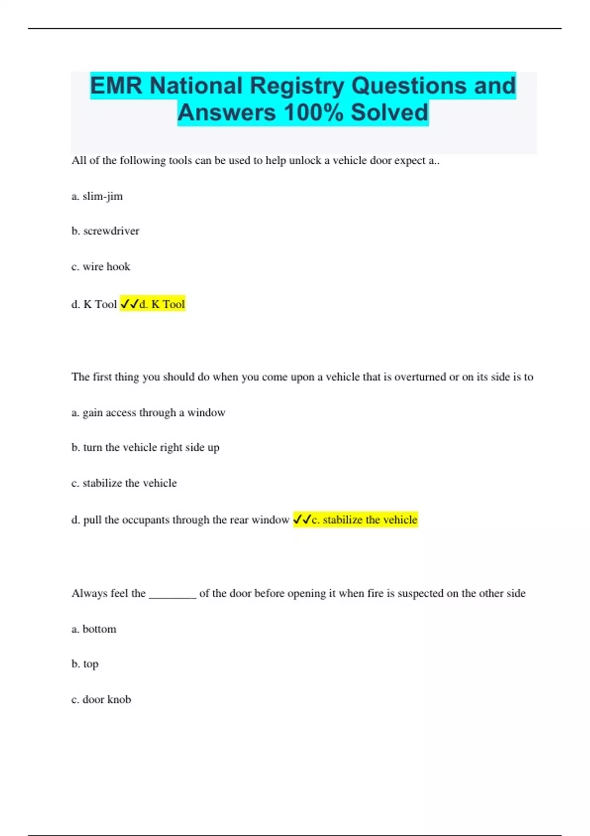 EMR National Registry Questions and Answers 100% Solved All of the following tools can be used to help unlock a vehicle door expect a.. a. slim-jim b. screwdriver c. wire hook d. K Tool d. K Tool The first thing you should do when you come upon a vehicle that is overturned or on its side is to a. gain access through a window b. turn the vehicle right side up c. stabilize the vehicle d. pull the occupants through the rear window c. stabilize the vehicle Always feel the ________ of the door before opening it when fire is suspected on the other side a. bottom b. top c. door knob d. door jamb b. top If you suspect a gas leak, do not a. use the doorbell b. transmit on your radio c. turn on/off the lights d. do all of the above d. do all of the above Remove patients from a vehicle only when a. life saving care is required b. the patient is having an anxiety attack c. they would be more comfortable in your vehicle d. there is severe weather approaching a. life saving care is required Which of the following is not a part of the upper respiratory system a. alveoli b. nasopharynx c. oropharynx d. larynx e. epiglottis a. alveoli The _________ is a tubular structure that begins below the vocal cords and extends into the chest and carries air into and out of the lungs a. bronchi b. alveoli c. trachea d. epiglottis e. bronchioles c. trachea The ________ are small sacs at the end of the respiratory system where the exchange of gases occurs with the bloodstream a. bronchioles b. bronchi c. cilia d. alveoli e. vocal cords d. alveoli The best method of opening the airway in patients who have suffered, or potentially suffered, a traumatic injury is a. the head tilt-chin lift method b. the jaw thrust c. the nasopharyngeal method d. any of the above methods may be used b. the jaw thrust Suctioning should be performed for no longer than _____ seconds in adult patients a. 5 b. 10 c. 15 d. 20 e. 25 c. 15 An acceptable tool for first responders to use in ventilating a patient is a. a pocket mask b. an intubation kit