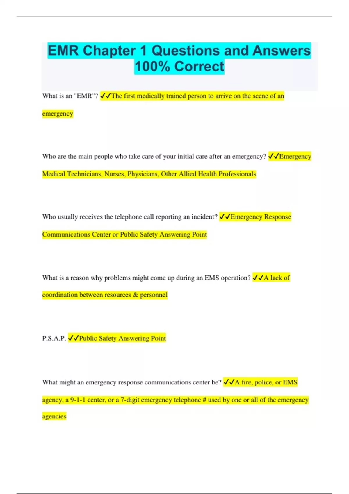 EMR Chapter 1 Questions and Answers 100% Correct What is an "EMR"? The first medically trained person to arrive on the scene of an emergency Who are the main people who take care of your initial care after an emergency? Emergency Medical Technicians, Nurses, Physicians, Other Allied Health Professionals Who usually receives the telephone call reporting an incident? Emergency Response Communications Center or Public Safety Answering Point What is a reason why problems might come up during an EMS operation? A lack of coordination between resources & personnel P.S.A.P. Public Safety Answering Point What might an emergency response communications center be? A fire, police, or EMS agency, a 9-1-1 center, or a 7-digit emergency telephone # used by one or all of the emergency agencies How does dispatch usually occur? Pager, Radio, Telephone, Computer, Other means What is a key survival factor for people in cardiac arrest? The length of time between when the heartbeat stops & when manual cardiopulmonary resuscitation starts C.P.R. Cardiopulmonary Resusciation A properly equipped vehicle & the EMT staff that staff it make up a what...? A Basic Life Support unit B.L.S. Basic Life Support Who continues the care begun by EMRs? EMTs What do EMTs do? Stabilize the patient's condition further than the EMTs have done, & prepare the patient for transport to the emergency department of the hospital BLS services are provided by whom? EMTs E.M.T. Emergency Medical Technician A.L.S. Advanced Life Support What might a patient receive in addition to BLS services? ALS services How many hours of training has an EMT completed? At least 150 hours Who provides Advanced Life Support? Paramedics Why do paramedics receive so many more additional hours of training? So they can: Administer intravenous fluids & certain medications, defibrillation, & place airway tubes How many more hours of additional training do paramedics receive in addition to their BLS skills & knowledge of EMTs? At least 1,000 hours Defibrillation The administration of an electric shock to the heart of a patient who is experiencing a highly irregular heartbeat What is a highly irregular heartbeat also known as? Ventricular Fibrillation I.V. Fluids Intravenous Fluids Can defibrillation be done by am EMT or EMR? Yes, if they are specially trained What is the name of the special airway tube paramedics use to keep the patient's airway open? Endotracheal Tube A.E.M.T. Advanced Emergency Medical Technician What are AEMTs able to perform? Limited ALS skills How many hours of training do AEMTs complete, at the very least? 300 hours Who do AEMTs work with? Either alone, or with a paramedic on an ALS unit Where does a patient's 3rd contact with the EMS system usually occur? The hospital - Primarily the emergency department What is taught in the EMR class? Airway Maintenance; Bleeding Control; Prevention, Recognition, & Treatment of shock Examples of specialized treatment facilities Trauma Centers, Stroke Centers, Pediatric Centers, Poison Control Centers, Perinatal Centers 2 things that the EMS system is considered Considered to be part of the public safety function of government, and considered to be a component of public health Responsibilities of public health departments Monitor the sanitation of restaurants, conduct immunization programs, determine the incidence of contagious diseases, prevent the incidence of contagious diseases Examples of public health & public safety educational programs Car seat installation programs, programs to encourage seatbelt use, alcohol awareness programs, programs to encourage helmet use, blood pressure screenings, diabetes screenings What is the CDC & what do they do? The CDC is one health agency that monitors the incidence of diseases & provides the standard precaution guidelines we use to prevent the spread of contagious diseases C.D.C. Centers for Disease Control & Prevention Ambulances were first used...? To remove wounded patients from the battlefield during the Civil War When were Traction Splints first used & what is their significance? WWI. They greatly reduced the death rate from fractured femurs. In the 50s & 60s, what training was required for ambulance attendants, & interns who staffed hospital-based ambulances? Basic First Aid In the 50s & 60s, who provided the most ambulance services? Funeral homes, Hospitals, volunteer rescue squads In the 50s & 60s, what were hearses used for? Transporting ill & injured patients In the early 70s, what did the US Department of Transportation develop? A national standard curriculum for training EMS providers: "National EMS Education Standards" When did the use of ALS within EMS become common? 1980s N.H.T.S.A. National Highway Traffic Safety Administration Who evaluates EMS systems based on the decided 10 criteria? The NHTSA of the US Department of Transportation 10 Standard Components of an EMS System 1) Regulation & Policy 2) Resource Management 3) Human Resources & Training 4) Transportation Equipment & Systems 5) Medical & Support Facilities 6) Communications System 7) Public Info & Education 8) Medical Direction 9) Trauma System & Development 10) Evaluation 3 "Transport" Terms Transport, Prompt Transport, Rapid Transport "Transport" Patient needs help from medical professional, time not important factor "Prompt Transport" Patient needs to be taken to an appropriate medical facility in a fairly short amount of time "Rapid Transport" EMS personnel are unable to give the patient adequate life-saving care in the field