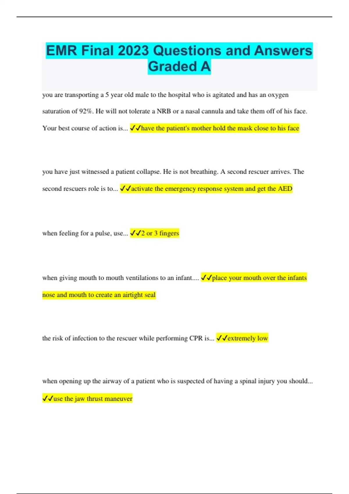 EMR Final 2023 Questions and Answers Graded A you are transporting a 5 year old male to the hospital who is agitated and has an oxygen saturation of 92%. He will not tolerate a NRB or a nasal cannula and take them off of his face. Your best course of action is... have the patient's mother hold the mask close to his face you have just witnessed a patient collapse. He is not breathing. A second rescuer arrives. The second rescuers role is to... activate the emergency response system and get the AED when feeling for a pulse, use... 2 or 3 fingers when giving mouth to mouth ventilations to an infant.... place your mouth over the infants nose and mouth to create an airtight seal the risk of infection to the rescuer while performing CPR is... extremely low when opening up the airway of a patient who is suspected of having a spinal injury you should... use the jaw thrust maneuver which of the following signs is not likely to be present in a patient with a severe airway... violent coughing you have witnessed a patient go into cardiac arrest and began CPR after sending a second rescuer to activate the emergency response system and get an AED. When a third rescuer arrives he should... help with bag mask ventilation which type of oxygen regulator only has 1 gauge and way to regulate the flow rate high pressure regulator a round of CPR should last 5 cycles or approximately: 2 minutes all of the following choices are true of an agonal gasp except they are always forceful and make the patient's head move when transporting a victim by stretcher you can leave the AED powered on and attached you are checking to see if a patient is responsive when he or she lets out an agonal gasp. This is... not normal breathing which of the following is considered to be an early sign of hypoxia disorientation your partner is delivering mouth-to-mouth ventilations to a patient while you are in charge of chest compressions. your partner is delivering quick, forceful breaths to minimize interruptions in chest compressions. Which of the following statements is true about the scenario? your partner should be giving slow breaths over a 2 second period delivering quick forceful breaths is inappropriate and causes air to enter the stomach instead of the lungs if you are alone and find that a patient is not breathing and you have already activated the emergency response system you should... get an AED and return to the victim when performing mouth to mouth breaths on an adult it is important to... take a regular breath and seal your lips around the victims mouth 2 rescuer CPR is performed at a ratio of what in a child? 15 to 2 when using a simple face mask deliver air over 1 second you are performing abdominal thrust on a patient who becomes unresponsive. the very first thing you should do is... activate the emergency response system gastric inflation can cause all of the following conditions except emphysema you are on the scene of the 77 year old female who is not breathing. This condition is best described as... apnea You witnessed a patient become unresponsive after choking. The correct order of procedures is to: start chest compressions, open the victims mouth, look for an occluding object then remove it with your fingers a rescuers exhaled air contains approximately 17% oxygen at what point is a child considered an adult in relation to CPR after the onset of puberty proper technique when performing the head tilt/chin lift includes... placing your finger on the bony part of the lower jaw and bringing the chin forward if breathing is inadequate or absent providing rescue breathing can... prevent cardiac arrest the ratio for compressions to breaths for a child with just one rescuer is... 30 to 2 compressions should be performed at a rate of at least 100/min the emergency medical services system may be best defined as a... network of resources that provide care to the ill or injured the EMR is one link in the chain of services that forms the... Emergency Medical Services (EMS) System one of your most important roles as an EMR is... protecting yourself and your crew maintaining a professional appearance as an EMR is important because it... instills confidence in patients and their families Kris, your partner has just returned from a call involving the severe injury of a child. Kris is nauseous and irritable. You recognize... an emotional response to the stress of the call Returning to the station after the death of a patient, you observe that your partner is "not himself" you have the same perception the next day and also notice that he is having a hard time making decisions and concentrating. a likely cause is critical incident stress EMRs may contract infectious disease by way of contaminated objects droplets coughed or sneezed into mouth, nose or eyes blood to blood contact The term "body substance isolation" may best be defined as ________. assuming that all body fluids are potentially infectious which of the following statements is true handwashing is the most effective means of preventing spread of disease An EMR's scope of practice is defined by ________. provincial law and local regulations it is acceptable for EMRs to go beyond their scope of practice never The patient and her family do not want CPR performed in the event that she becomes breathless and pulseless. What would permit an EMS responder to follow those wishes? a do not resuscitate order a competent adult may refuse treatment for any reason whatsoever an EMR provides emergency care to an adult who is unconscious and seriously injured. this is an example of... implied consent during which phase of an ems response will you first hear details of a call dispatch you have just reported that you are on your way to the scene of a vehicle collision at the intersection of W Hastings and Cambie streets. what phase of an EMS response are you in en route to the scene in which phase of a response would you check and ready your equipment for service? preparation you repor