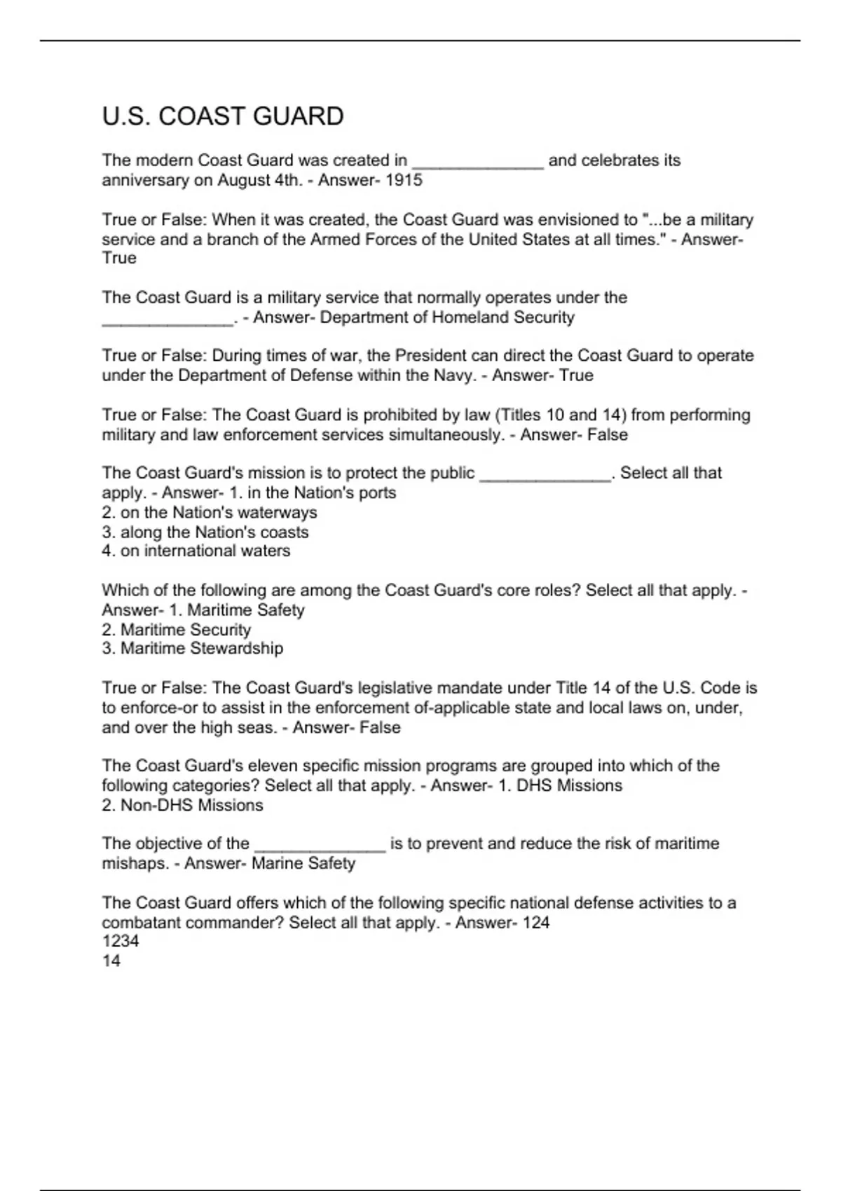 The modern Coast Guard was created in ______________ and celebrates its anniversary on August 4th. - Answer- 1915 True or False: When it was created, the Coast Guard was envisioned to "...be a military service and a branch of the Armed Forces of the United States at all times." - Answer- True The Coast Guard is a military service that normally operates under the ______________. - Answer- Department of Homeland Security True or False: During times of war, the President can direct the Coast Guard to operate under the Department of Defense within the Navy. - Answer- True True or False: The Coast Guard is prohibited by law (Titles 10 and 14) from performing military and law enforcement services simultaneously. - Answer- False The Coast Guard's mission is to protect the public ______________. Select all that apply. - Answer- 1. in the Nation's ports 2. on the Nation's waterways 3. along the Nation's coasts 4. on international waters Which of the following are among the Coast Guard's core roles? Select all that apply. - Answer- 1. Maritime Safety 2. Maritime Security 3. Maritime Stewardship True or False: The Coast Guard's legislative mandate under Title 14 of the U.S. Code is to enforce-or to assist in the enforcement of-applicable state and local laws on, under, and over the high seas. - Answer- False The Coast Guard's eleven specific mission programs are grouped into which of the following categories? Select all that apply. - Answer- 1. DHS Missions 2. Non-DHS Missions The objective of the ______________ is to prevent and reduce the risk of maritime mishaps. - Answer- Marine Safety The Coast Guard offers which of the following specific national defense activities to a
