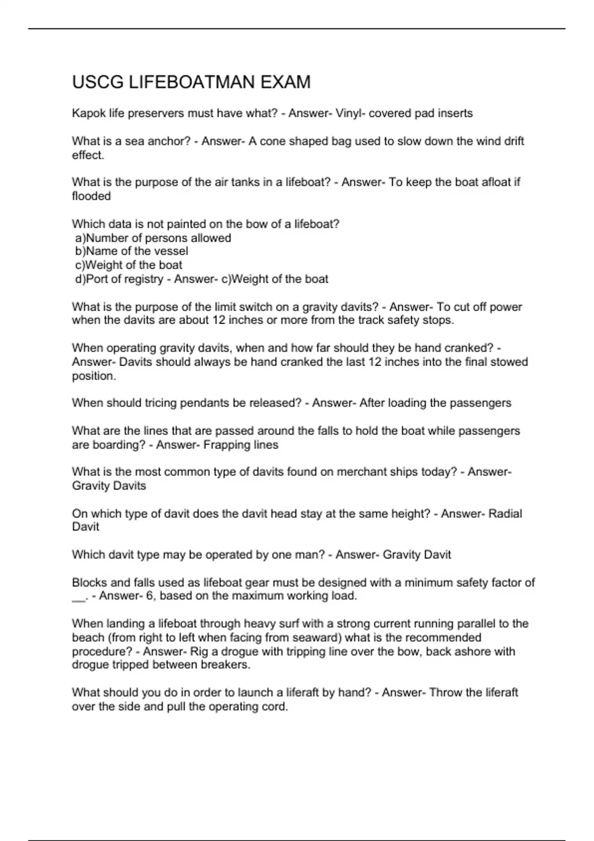 Kapok life preservers must have what? - Answer- Vinyl- covered pad inserts What is a sea anchor? - Answer- A cone shaped bag used to slow down the wind drift effect. What is the purpose of the air tanks in a lifeboat? - Answer- To keep the boat afloat if flooded Which data is not painted on the bow of a lifeboat? a)Number of persons allowed b)Name of the vessel c)Weight of the boat d)Port of registry - Answer- c)Weight of the boat What is the purpose of the limit switch on a gravity davits? - Answer- To cut off power when the davits are about 12 inches or more from the track safety stops. When operating gravity davits, when and how far should they be hand cranked? - Answer- Davits should always be hand cranked the last 12 inches into the final stowed position. When should tricing pendants be released? - Answer- After loading the passengers What are the lines that are passed around the falls to hold the boat while passengers are boarding? - Answer- Frapping lines What is the most common type of davits found on merchant ships today? - Answer- Gravity Davits On which type of davit does the davit head stay at the same height? - Answer- Radial Davit Which davit type may be operated by one man? - Answer- Gravity Davit Blocks and falls used as lifeboat gear must be designed with a minimum safety factor of __. - Answer- 6, based on the maximum working load. When landing a lifeboat through heavy surf with a strong current running parallel to the beach (from right to left when facing from seaward) what is the recommended procedure? - Answer- Rig a drogue with tripping line over the bow, back ashore with drogue tripped between breakers. What should you do in order to launch a liferaft by hand? - Answer- Throw the liferaft over the side and pull the operating cord.