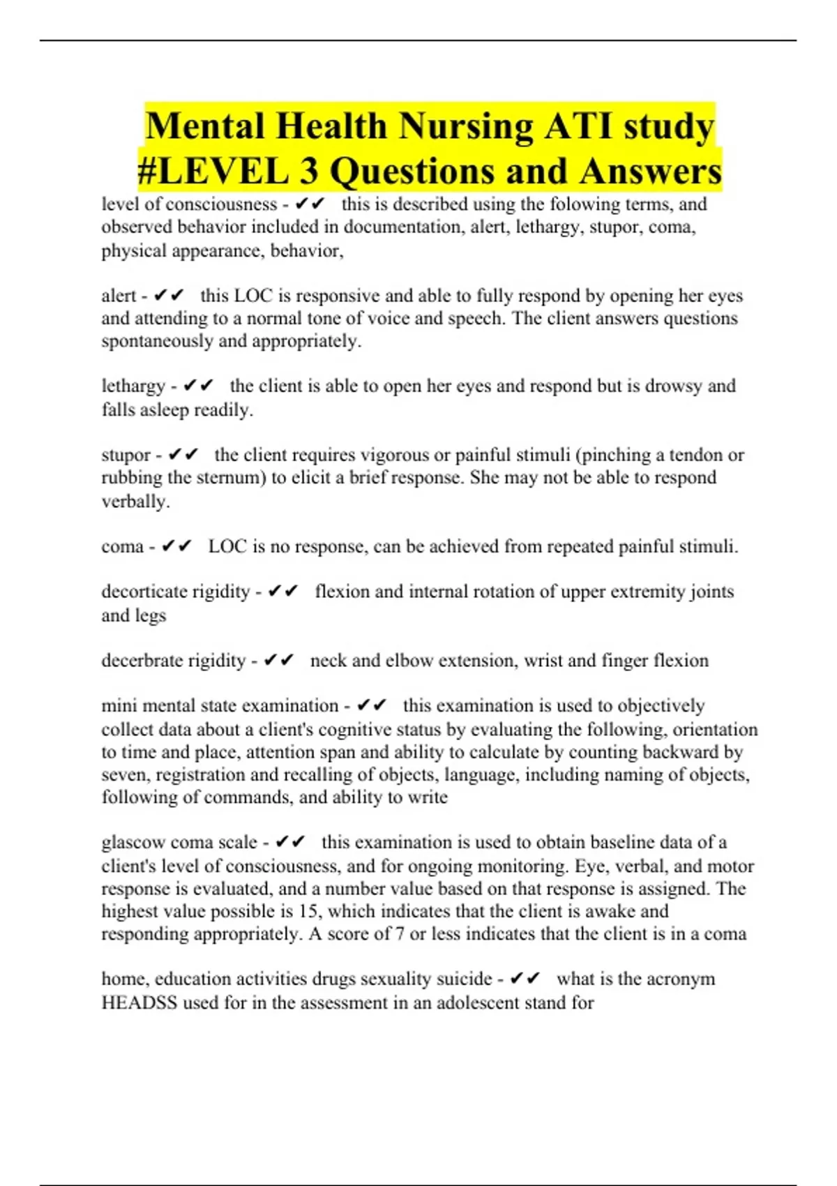 Mental Health Nursing ATI study #LEVEL 3 Questions and Answers