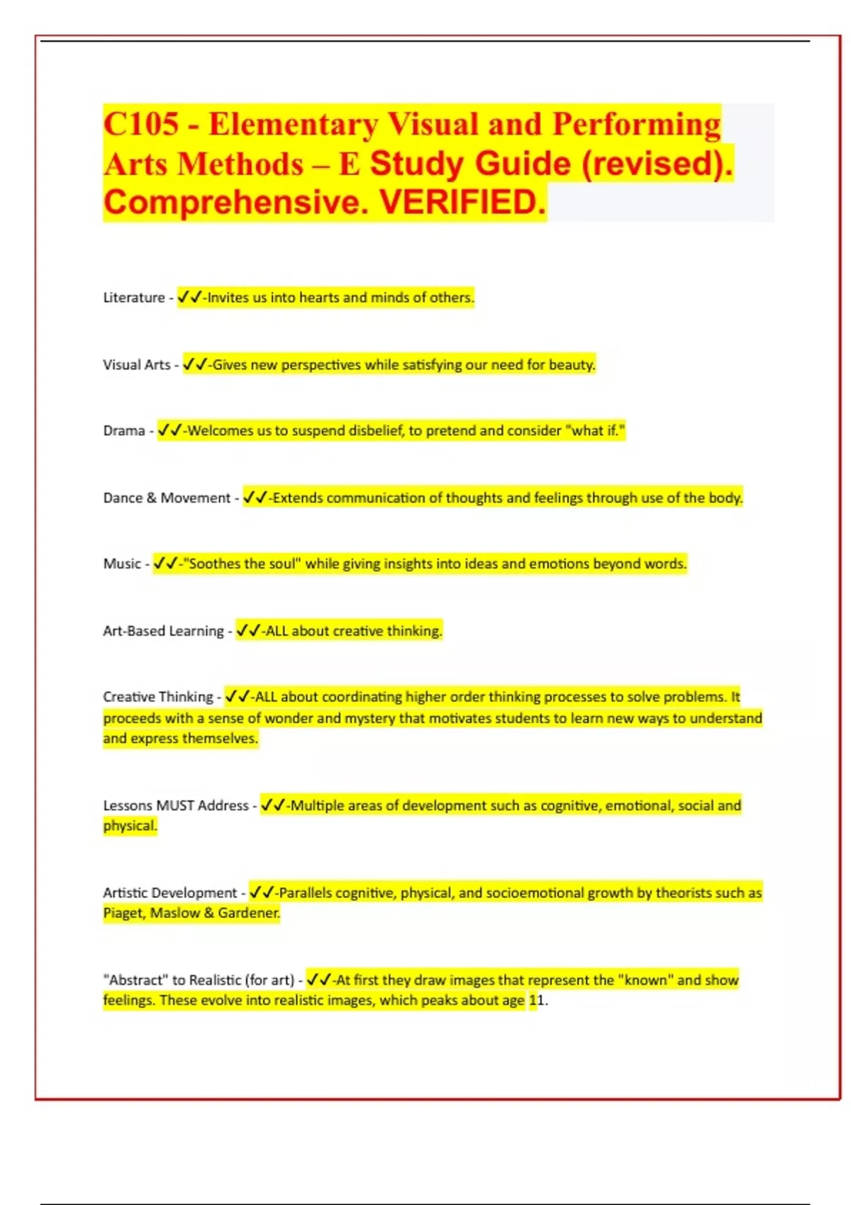 C105 - Elementary Visual and Performing Arts Methods – E Study Guide (revised). Comprehensive. VERIFIED 2024
