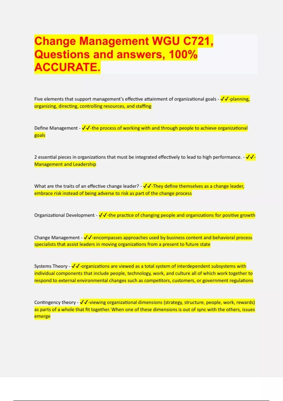 Change Management WGU C721, Questions and answers, 100% ACCURATE 2024 | 23 Pages