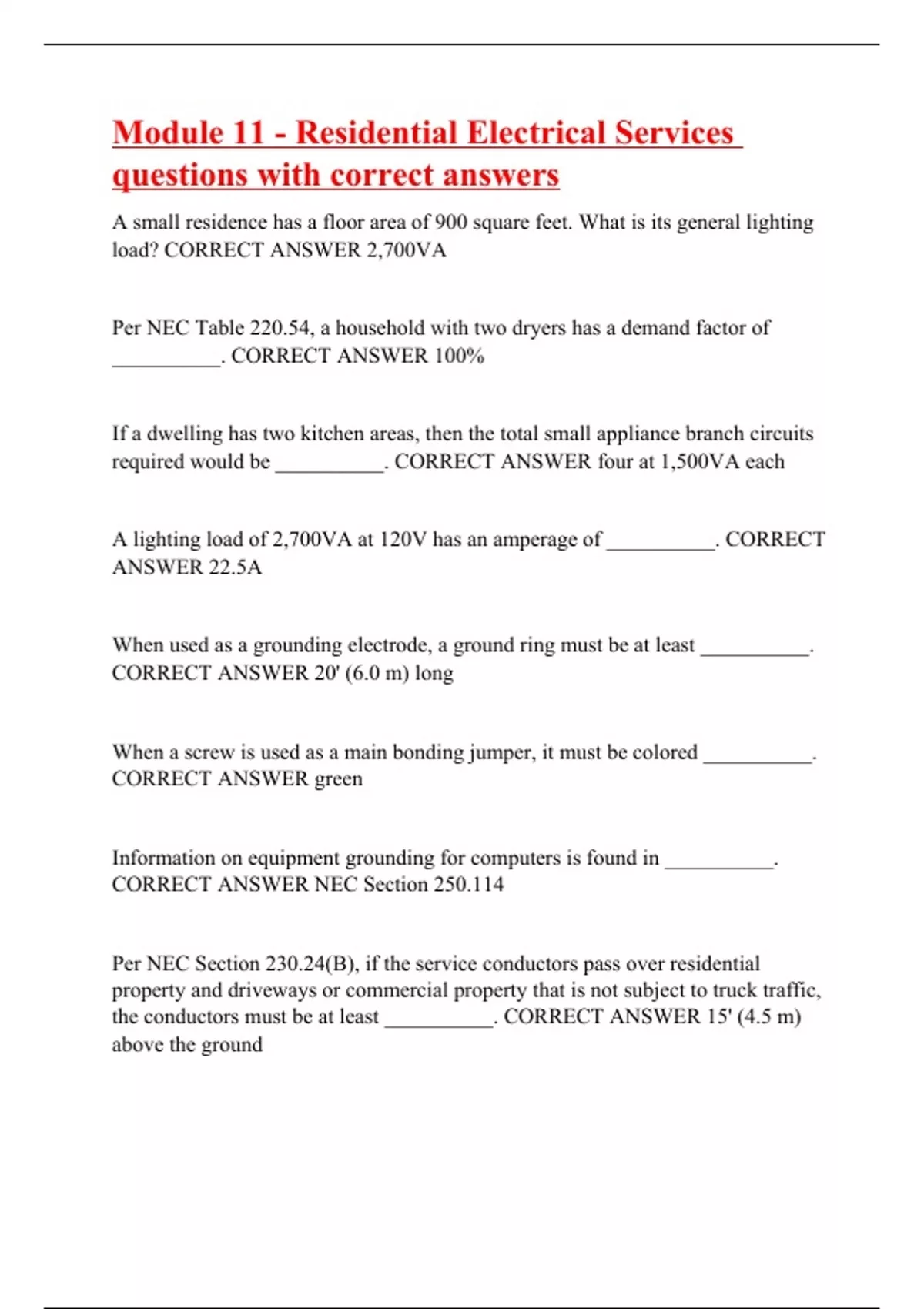 A small residence has a floor area of 900 square feet. What is its general lighting load? CORRECT ANSWER 2,700VA Per NEC Table 220.54, a household with two dryers has a demand factor of __________. CORRECT ANSWER 100% If a dwelling has two kitchen areas, then the total small appliance branch circuits required would be __________. CORRECT ANSWER four at 1,500VA each A lighting load of 2,700VA at 120V has an amperage of __________. CORRECT ANSWER 22.5A When used as a grounding electrode, a ground ring must be at least __________. CORRECT ANSWER 20' (6.0 m) long When a screw is used as a main bonding jumper, it must be colored __________. CORRECT ANSWER green Information on equipment grounding for computers is found in __________. CORRECT ANSWER NEC Section 250.114 Per NEC Section 230.24(B), if the service conductors pass over residential property and driveways or commercial property that is not subject to truck traffic, the conductors must be at least _______
