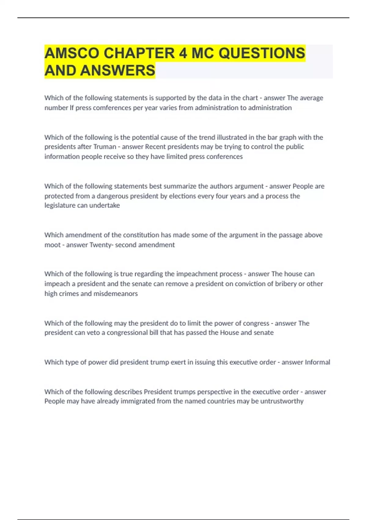 Which of the following statements is supported by the data in the chart The average number lf press comferences per year varies from administration to administration Which of the following is the potential cause of the trend illustrated in the bar graph with the presidents after Truman Recent presidents may be trying to control the public information people receive so they have limited press conferences Which of the following statements best summarize the authors argument People are protected from a dangerous president by elections every four years and a process the legislature can undertake Which amendment of the constitution has made some of the argument in the passage above moot Twenty- second amendment Which of the following is true regarding the impeachment process The house can impeach a president and the senate can remove a president on conviction of bribery or other high crimes and misdemeanors Which of the following may the president do to limit the power of congress The president can veto a congressional bill that has passed the House and senate Which type of power did president trump exert in issuing this executive order Informal Which of the following describes President trumps perspective in the executive order People may have already immigrated from the named countries may be untrustworthy With which statement would supporters of this executive order most like agree The president should make protecting the nation from foreign terrorism a top priority Which of the following is an accurate comparison of changes in the scope of presidency Time of national stability time of crisis