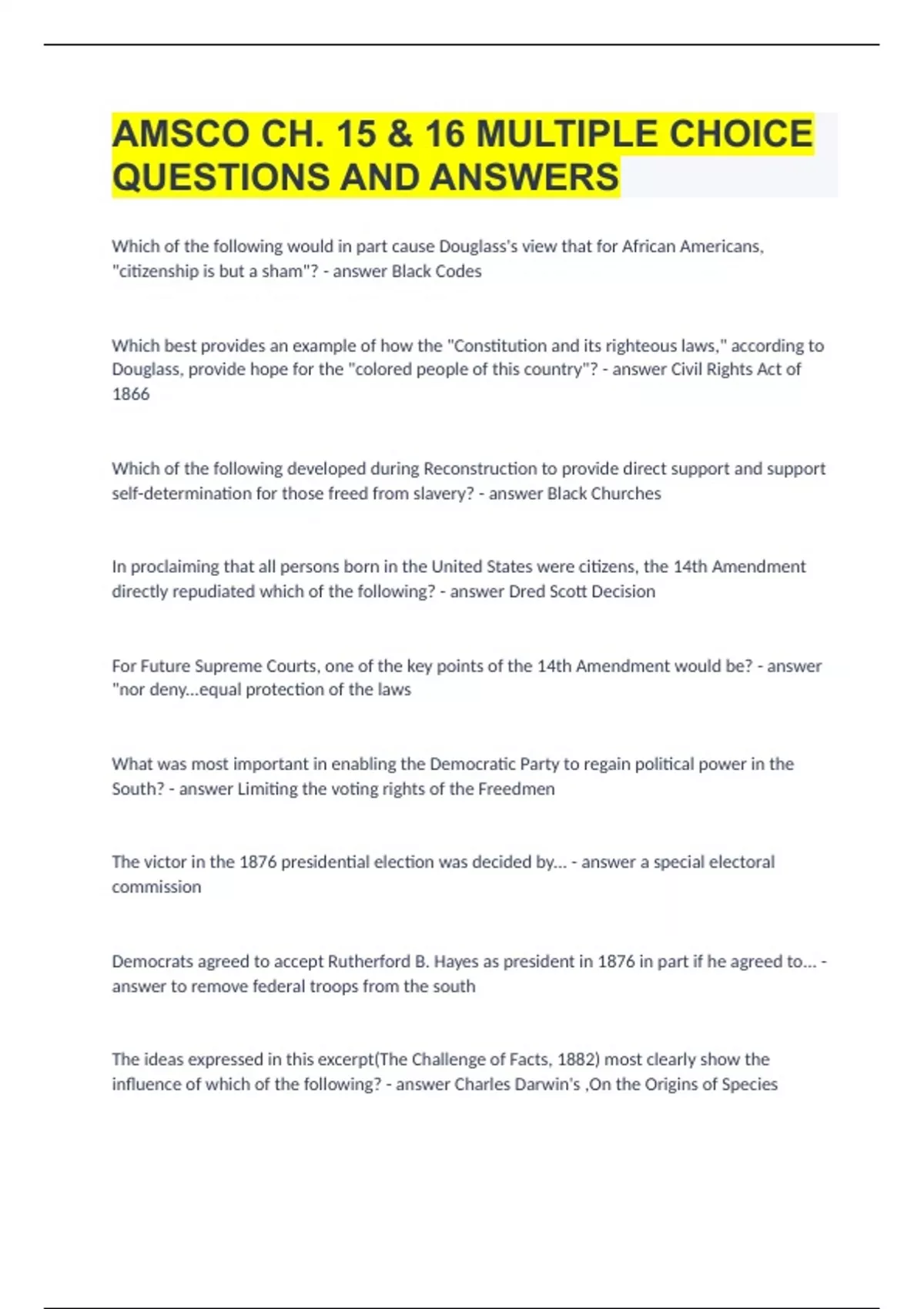 AMSCO CH. 15 & 16 MULTIPLE CHOICE QUESTIONS AND ANSWERS|GUARANTEED SUCCESS