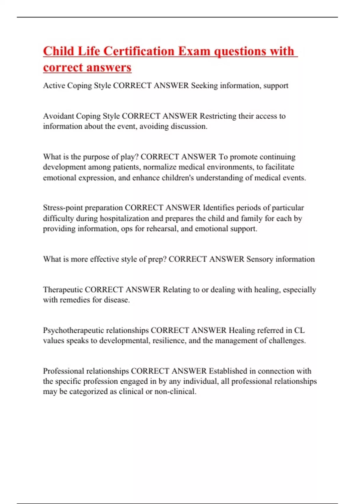 Active Coping Style CORRECT ANSWER Seeking information, support Avoidant Coping Style CORRECT ANSWER Restricting their access to information about the event, avoiding discussion. What is the purpose of play? CORRECT ANSWER To promote continuing development among patients, normalize medical environments, to facilitate emotional expression, and enhance children's understanding of medical events. Stress-point preparation CORRECT ANSWER Identifies periods of particular difficulty during hospitalization and prepares the child and family for each by providing information, ops for rehearsal, and emotional support. What is more effective style of prep? CORRECT ANSWER Sensory information Therapeutic CORRECT ANSWER Relating to or dealing with healing, especially with remedies for disease. Psychotherapeutic relationships CORRECT ANSWER Healing referred in CL values speaks to developmental, resilience, and the management of challenges. Professional relationships CORRECT ANSWER Established in connection with the specific profession engaged in by any individual, all professional relationships may be categorized as clinical or non-clinical.