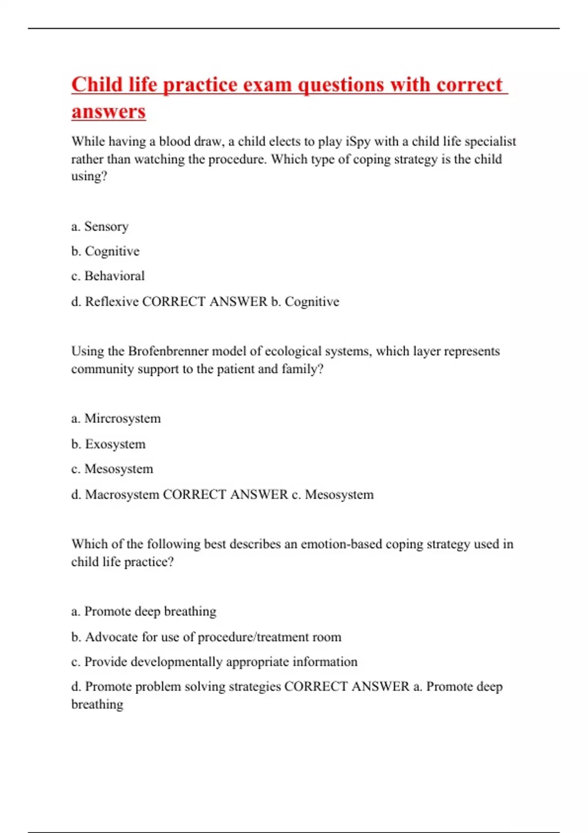 While having a blood draw, a child elects to play iSpy with a child life specialist rather than watching the procedure. Which type of coping strategy is the child using? a. Sensory b. Cognitive c. Behavioral d. Reflexive CORRECT ANSWER b. Cognitive Using the Brofenbrenner model of ecological systems, which layer represents community support to the patient and family? a. Mircrosystem b. Exosystem c. Mesosystem d. Macrosystem CORRECT ANSWER c. Mesosystem Which of the following best describes an emotion-based coping strategy used in child life practice? a. Promote deep breathing b. Advocate for use of procedure/