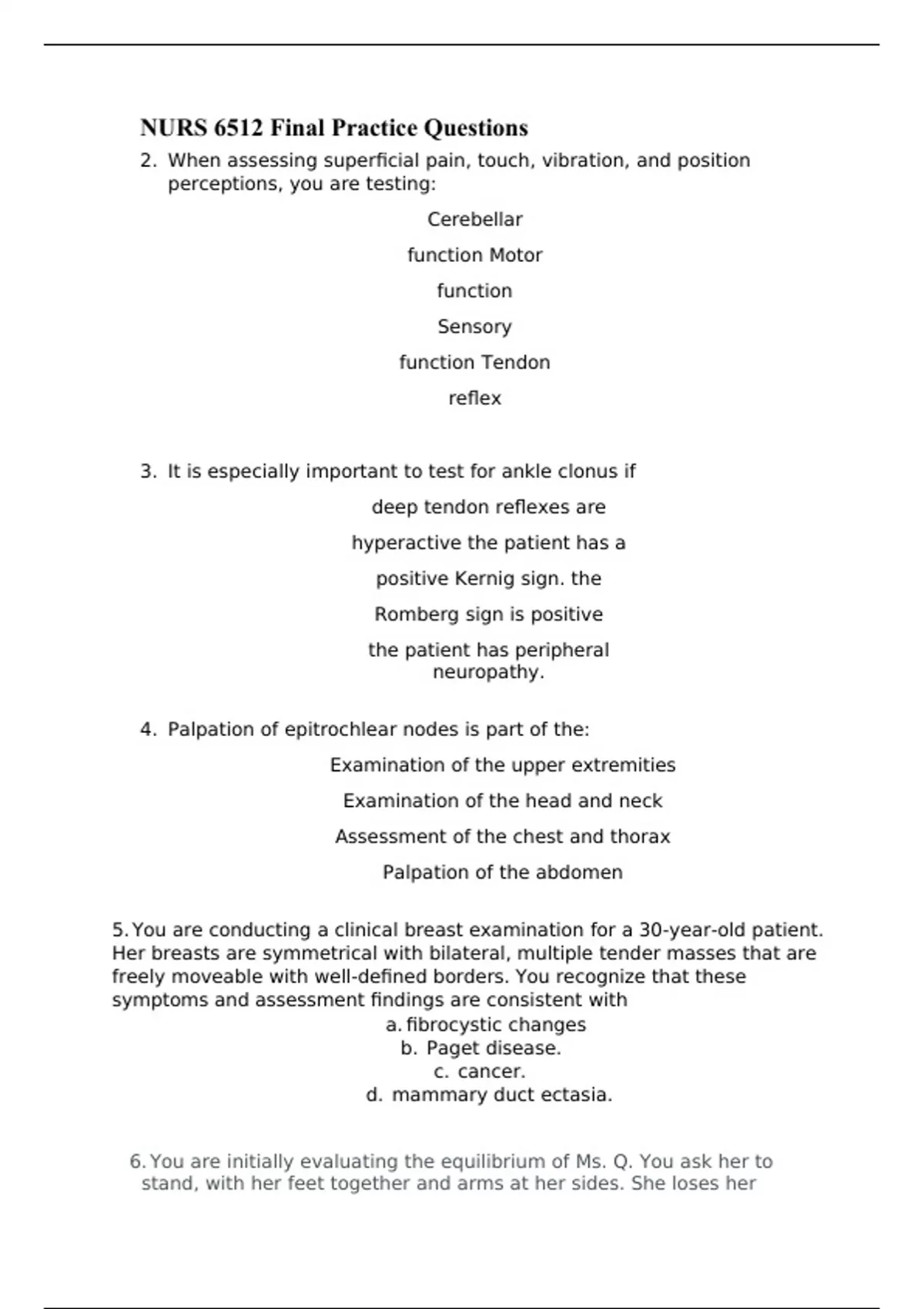 NURS 6512 Final Practice Questions 2. When assessing superficial pain, touch, vibration, and position perceptions, you are testing: Cerebellar function Motor function Sensory function Tendon reflex 3. It is especially important to test for ankle clonus if deep tendon reflexes are hyperactive the patient has a positive Kernig sign. the Romberg sign is positive the patient has peripheral neuropathy. 4. Palpation of epitrochlear nodes is part of the: Examination of the upper extremities Examination of the head and neck Assessment of the chest and thorax Palpation of the abdomen 5. You are conducting a clinical breast examination for a 30-year-old patient. Her breasts are symmetrical with bilateral, multiple tender masses that are freely moveable with well-defined borders. You recognize that these symptoms and assessment findings are consistent with a. fibrocystic changes b. Paget disease. c. cancer. d. mammary duct ectasia. 6. You are initially evaluating the equilibrium of Ms. Q. You ask her to stand, with her feet together and arms at her sides. She loses her balance. Ms. Q has a positive: Kernig sign. Homan sign. McMurray test. Romberg sign. 7. A 23-year-old white woman has come to the clinic because she has missed two menstrual periods. She states that her breasts have enlarged and that her nipples have turned a darker color. Your further response to this finding is to A. instruct her that this is a side effect of birth control injection therapy. B. suggest pregnancy testing. C. question her use of tanning beds. D. schedule an appointment with a surgeon. 8. pulsation that is diminished to the point of being barely palpable would be graded as: 1 3 2 0 9. Red, hot swollen joint in a 40-year-old man should lead you to suspect A. trauma. B. bursitis. C. gout. D. cellulitis. 10. To assess a cremasteric reflex, the examiner strokes the A. skin around the anus and observes for the anal wink. B. abdomen and observes whether the umbilicus moves away from the stimulus. C. inner thigh and observes whether the testicle and scrotum rise on the stroked side. D. palm and observes whether the fingers attempt to grasp. 11. A 12-year-old boy says that his left scrotum has a soft swollen mass. The scrotum is not painful upon palpation. The left inguinal canal is without masses. The mass does transilluminate with a penlight. This collection of symptoms is consistent with A. orchitis. B. hydrocele. C. rectocele. D. scrotal hernia 12. During a routine prenatal visit, Ms. T. was noted as having dependent edema, varicosities of the legs, and hemorrhoids. She expressed concern about these symptoms. You explain to Ms. T. that her enlarged uterus is compressing her pelvic veins and her inferior vena cava. You would further explain that these findings a. are usual conditions during pregnancy. b. indicate a need for hospitalization. c. indicate the need for amniocentesis. d. suggest that she is having twins. 13. The best way to ease the apprehension of a 3-year-old child before a physical examination is to: a. explain that you will be gentle. b. hand the child a picture book. c. let the child hold the stethoscope while you listen. d. tell the child that he or she will get a lollipop for good behavior. 14. Which portion of the physical examination is best done with the patient standing? Neurologic Musculoskeletal Spinal Rectal 15. Cranial nerve XII may be assessed in an infant by A. watching the infant's facial expressions when crying. B. observing the infant suck and swallow. C. clapping hands and watching the infant blink. D. observing the infant's rooting reflex. 16. If pitting edema is unilateral, you would suspect occlusion of a A. lymphatic duct. B. major vein. C. surface capillary. D. superficial artery. 17. For purposes of examination and communication of physical findings, the breast is divided into A. halves (upper and lower). B. thirds (left, middle, and right). C. four quadrants plus a tail. D. circles (six consecutive rings, each 1 inch farther away from nipple). 18. A parent is advised to restrict contact sports participation for their child. An example of a sport in which this child could participate is: a. hockey. b. roller skating. c. riflery. d. skateboarding. 19. The presence of cervical motion tenderness may indicate: a. pregnancy. b. nulliparity. c. pelvic inflammatory disease. d. vulvovaginitis. 20. Facial muscle or tongue weakness may result in: a. aphasia. b. impaired comprehension. c. neologisms. d. echolalia. 21. An ophthalmoscopic eye examination involves Visual field assessment Lens inspection. Sclera observation Near vision evaluation 22. A patient in the deepest coma would be scored on the Glasgow Coma Scale. 3 1 15 10