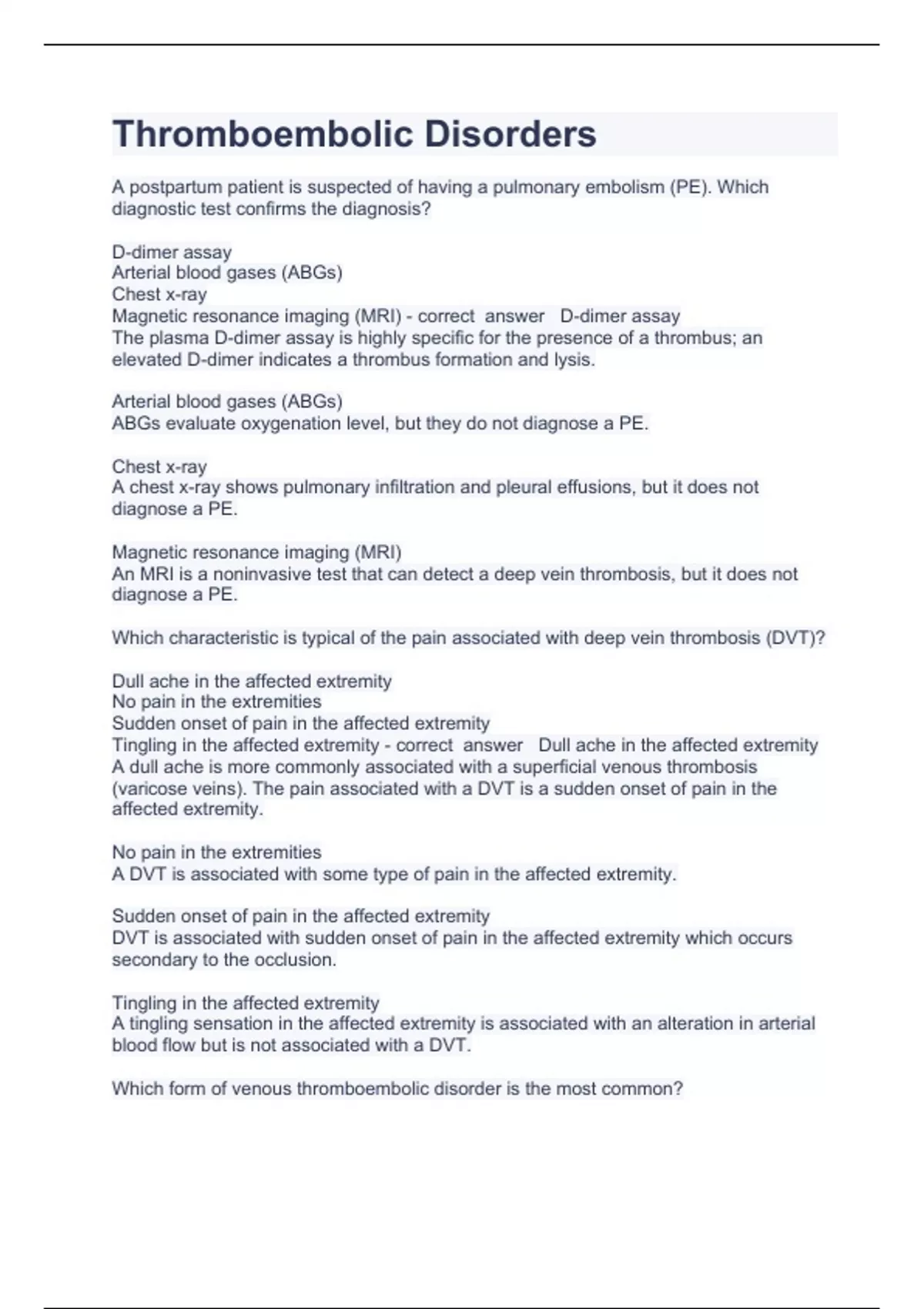 Thromboembolic Disorders a questions with completed solutions 2023