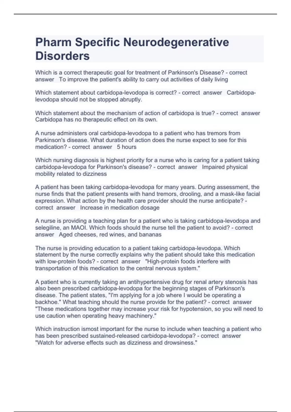 Pharm Specific Neurodegenerative Disorders questions and answers rated A+ 2023