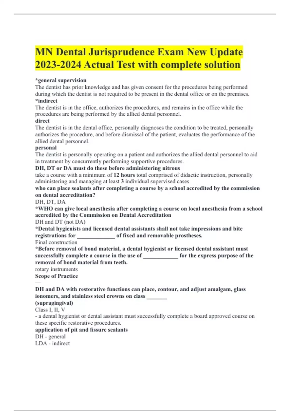 *general supervision The dentist has prior knowledge and has given consent for the procedures being performed during which the dentist is not required to be present in the dental office or on the premises. *indirect The dentist is in the office, authorizes the procedures, and remains in the office while the procedures are being performed by the allied dental personnel. direct The dentist is in the dental office, personally diagnoses the condition to be treated, personally authorizes the procedure, and before dismissal of the patient, evaluates the performance of the allied dental personnel. personal The dentist is personally operating on a patient and authorizes the allied dental personnel to aid in treatment by concurrently performing supportive procedures. DH, DT or DA must do these before administering nitrous take a course with a minimum of 12 hours total comprised of didactic instruction, personally administering and managing at least 3 individual supervised cases who can place sealants after completing a course by a school accredited by the commission on dental accreditation? DH, DT, DA *WHO can give local anesthesia after completing a course on local anesthesia from a school accredited by the Commission on Dental Accreditation DH and DT (not DA) *Dental hygienists and licensed dental assistants shall not take impressions and bite registrations for _____________ of fixed and removable prostheses. Final construction *Before removal of bond material, a dental hygienist or licensed dental assistant must successfully complete a course in the use of ____________ for the express purpose of the removal of bond material from teeth. rotary instruments Scope of Practice --- DH and DA with restorative functions can place, contour, and adjust amalgam, glass ionomers, and stainless steel crowns on class _______ (supragingival) Class I, II, V - a dental hygienist or dental assistant must successfully complete a board approved course on these specific restorative procedures. application of pit and fissure sealants DH - general LDA - indirect *Administer LA DH - general *monitor a patient on nitrous DH - General LDA - Indirect T/F -- DH or LDA shall NOT take impressions and bite registrations for the FINAL construction of fixed and removable prostheses. True *Utilizing rotary instruments for the removal of bond material from teeth DH - indirect LDA - indirect Performing any or all restorative procedures limited to placing, contouring, & adjusting amalgam, glass ionomers, and Class I and V supra composite restorations DH - indirect LDA - indirect *managing and removing IV lines DH - indirect LDA - indirect *placing an IV line DH - direct LDA - direct administering any medications or agents Personal DH and RDA *Perform preliminary charting including assessments and existing restoration, determine the perio status, and formulate the DH tx plan in coordination with DDS DH - general *make referrals in consultation with DDS DH - general *complete prophy with scaling, root planing, and polishing restorations DH - general