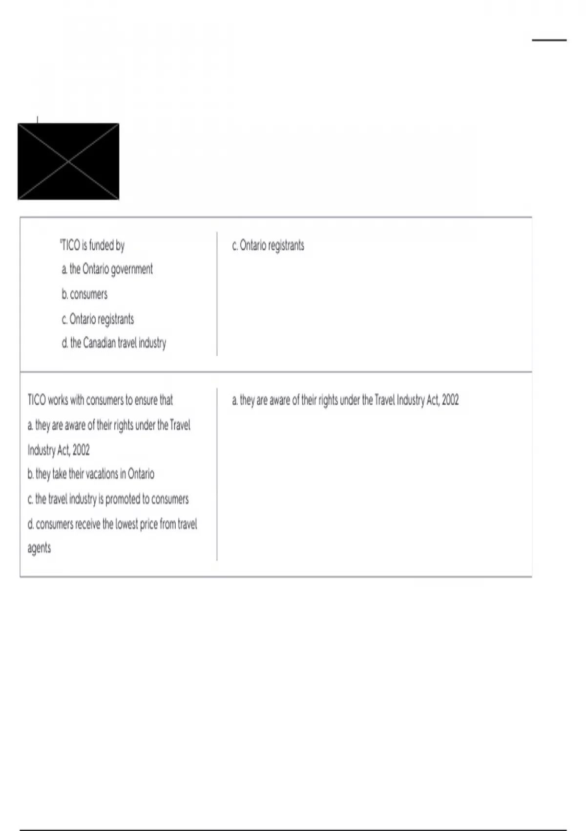 TICO EXAM QUESTIONS AND ANSWERS FOR 2023/2024 | REAL EXAMS TICO is funded by a. the Ontario government b. consumers c. Ontario registrants d. the Canadian travel industry TICO works with consumers to ensure that a. they are aware of their rights under the Travel Industry Act, 2002 b. they take their vacations in Ontario c. the travel industry is promoted to consumers d. consumers receive the lowest price from travel agents TICO enhances industry professionalism in many ways, including a. offering courses to travel counsellors to enhance their skill b. maintaining an informative and up-to-date website c. encouraging consumers to consider a career in travel d. working with end suppliers