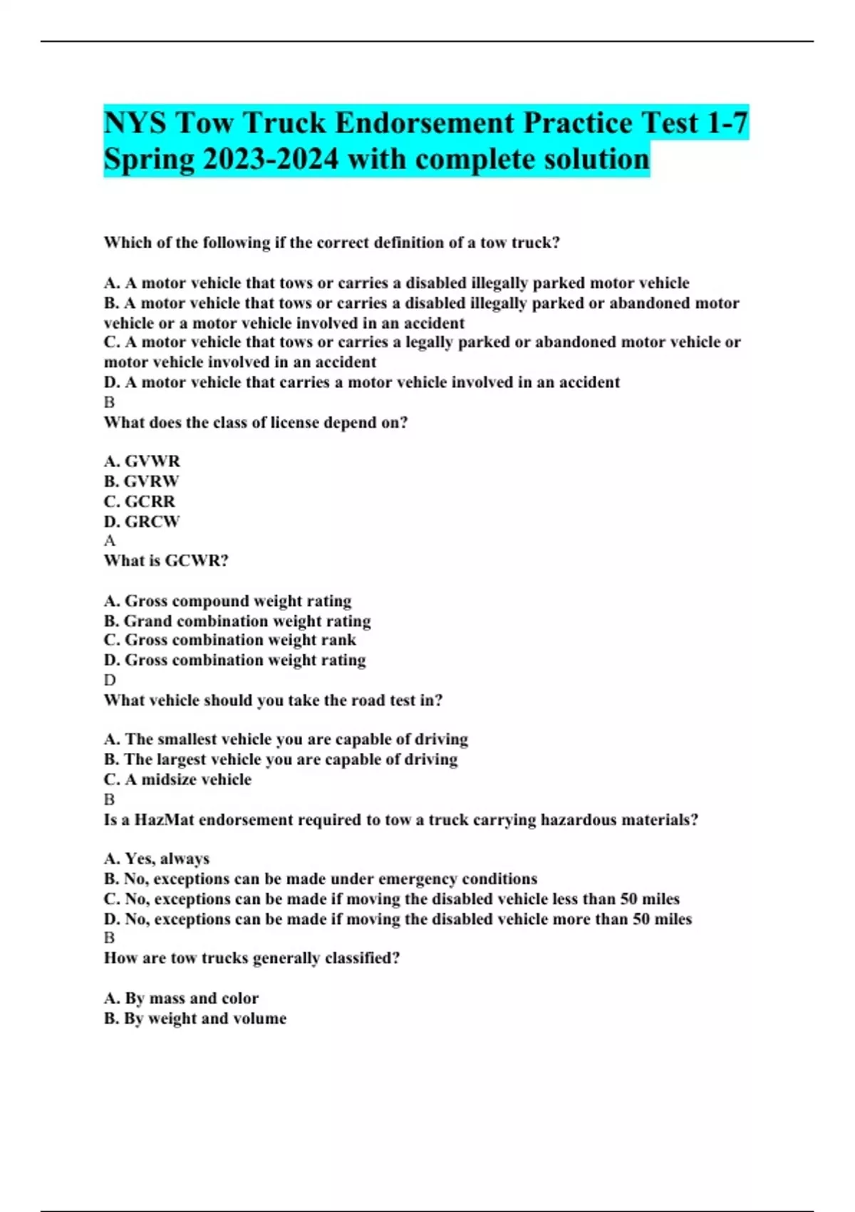 Which of the following if the correct definition of a tow truck? A. A motor vehicle that tows or carries a disabled illegally parked motor vehicle B. A motor vehicle that tows or carries a disabled illegally parked or abandoned motor vehicle or a motor vehicle involved in an accident C. A motor vehicle that tows or carries a legally parked or abandoned motor vehicle or motor vehicle involved in an accident D. A motor vehicle that carries a motor vehicle involved in an accident B What does the class of license depend on? A. GVWR B. GVRW C. GCRR D. GRCW A What is GCWR? A. Gross compound weight rating B. Grand combination weight rating C. Gross combination weight rank D. Gross combination weight rating D What vehicle should you take the road test in? A. The smallest vehicle you are capable of driving B. The largest vehicle you are capable of driving C. A midsize vehicle B Is a HazMat endorsement required to tow a truck carrying hazardous materials? A. Yes, always B. No, exceptions can be made under emergency conditions C. No, exceptions can be made if moving the disabled vehicle less than 50 miles D. No, exceptions can be made if moving the disabled vehicle more than 50 miles B How are tow trucks generally classified? A. By mass and color B. By weight and volume C. By weight and body type D. By body type and mass C What is the GVWR of medium duty tow trucks? A. 10,001-26,000 pounds B. 8,600-10,000 pounds C. 11,000-25,000 pounds D. Over 26,000 pounds A What is the correct definition of a car carrier? A. Designed to transport 2-3 motor vehicles on a slanted platform that slides or tilts to the ground to facilitate the loading and unloading of vehicles B. Designed to transport 1-3 motor vehicles on a flat platform that is stationary to facilitate the loading and unloading of vehicles C. Designed to transport 2-3 motor vehicles on a flat platform that is stationary to facilitate the loading and unloading of vehicles D. Designed to transport 1-3 motor vehicles on a flat platform that slides or tilts to the ground to facilitate the loading and unloading of vehicles D What is the most common cause of death and injury to tow truck operators in an accident? A. Distracted driving B. Drunk driving C. Equipment failure