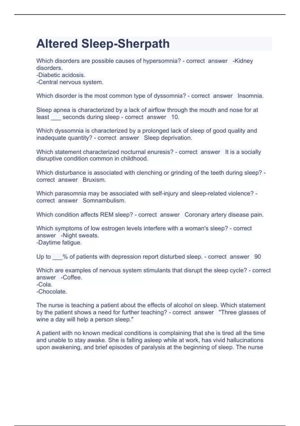 Altered Sleep questions and answers 100% correct 2023