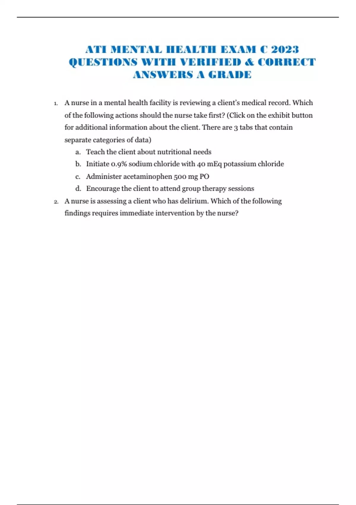 ATI MENTAL HEALTH EXAM C 2023 QUESTIONS WITH VERIFIED & CORRECT ANSWERS A GRADE