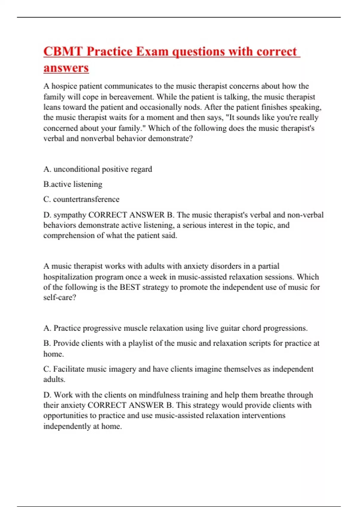 A hospice patient communicates to the music therapist concerns about how the family will cope in bereavement. While the patient is talking, the music therapist leans toward the patient and occasionally nods. After the patient finishes speaking, the music therapist waits for a moment and then says, "It sounds like you're really concerned about your family." Which of the following does the music therapist's verbal and nonverbal behavior demonstrate? A. unconditional positive regard B.active listening C. countertransference D. sympathy CORRECT ANSWER B. The music therapist's verbal and non-verbal behaviors demonstrate active listening, a serious interest in the topic, and comprehension of what the patient said. A music therapist works with adults with anxiety disorders in a partial hospitalization program once a week in music-assisted relaxation sessions. Which of the following is the BEST strategy to promote the independent use of music for self-care? A. Practice progressive muscle relaxation using live guitar chord progressions. B. Provide clients with a playlist of the music and relaxation scripts for practice at home. C. Facilitate music imagery and have clients imagine themselves as independent adults. D. Work with the clients on mindfu