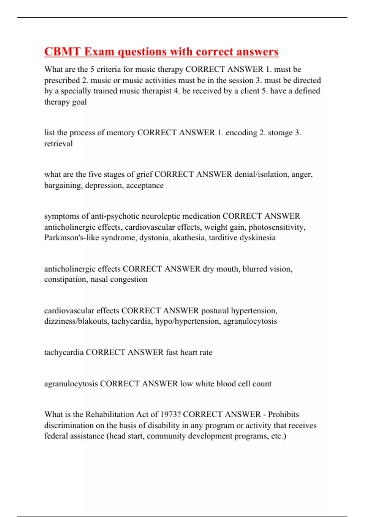 What are the 5 criteria for music therapy CORRECT ANSWER 1. must be prescribed 2. music or music activities must be in the session 3. must be directed by a specially trained music therapist 4. be received by a client 5. have a defined therapy goal list the process of memory CORRECT ANSWER 1. encoding 2. storage 3. retrieval what are the five stages of grief CORRECT ANSWER denial/isolation, anger, bargaining, depression, acceptance symptoms of anti-psychotic neuroleptic medication CORRECT ANSWER anticholinergic effects, cardiovascular effects, weight gain, photosensitivity, Parkinson's-like syndrome, dystonia, akathesia, tarditive dyskinesia anticholinergic effects CORRECT ANSWER dry mouth, blurred vision, constipation, nasal congestion cardiovascular effects CORRECT ANSWER postural hypertension, dizziness/blakouts, tachycardia, hypo/hypertension, agranulocytosis tachycardia CORRECT ANSWER fast heart rate agranulocytosis CORRECT ANSWER low white blood cell count What is the Rehabilitation Act