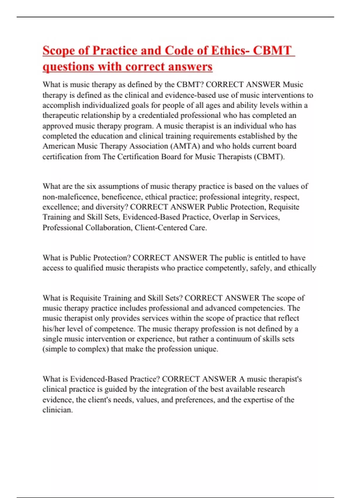 What is music therapy as defined by the CBMT? CORRECT ANSWER Music therapy is defined as the clinical and evidence-based use of music interventions to accomplish individualized goals for people of all ages and ability levels within a therapeutic relationship by a credentialed professional who has completed an approved music therapy program. A music therapist is an individual who has completed the education and clinical training requirements established by the American Music Therapy Association (AMTA) and who holds current board certification from The Certification Board for Music Therapists (CBMT). What are the six assumptions of music therapy practice is based on the values of non-maleficence, beneficence, ethical practice; professional integrity, respect, excellence; and diversity? CORRECT ANSWER Public Protection, Requisite Training and Skill Sets, Evidenced-Based Practice, Overlap in Services, Professional Collaboration, Client-Centered Care. What is Public Protection? CORRECT ANSWER The public is entitled to have access to qualified music therapists who practice competently, safely, and ethically What is Requisite Training and Skill Sets? CORRECT ANSWER The scope of music therapy practice includes professional and advanced competencies. The music therapist only provides services within the scope of practice that reflect his/her level of competence. The music therapy profession is not defined by a single music intervention or experience, but rather a continuum of skills sets (simple to complex) that make the profession unique. What is Evidenced-Based Practice? CORRECT ANSWER A music therapist's clinical practice is guided by the integration of the best available research evidence, the client's needs, values, and preferences, and the expertise of the clinician.