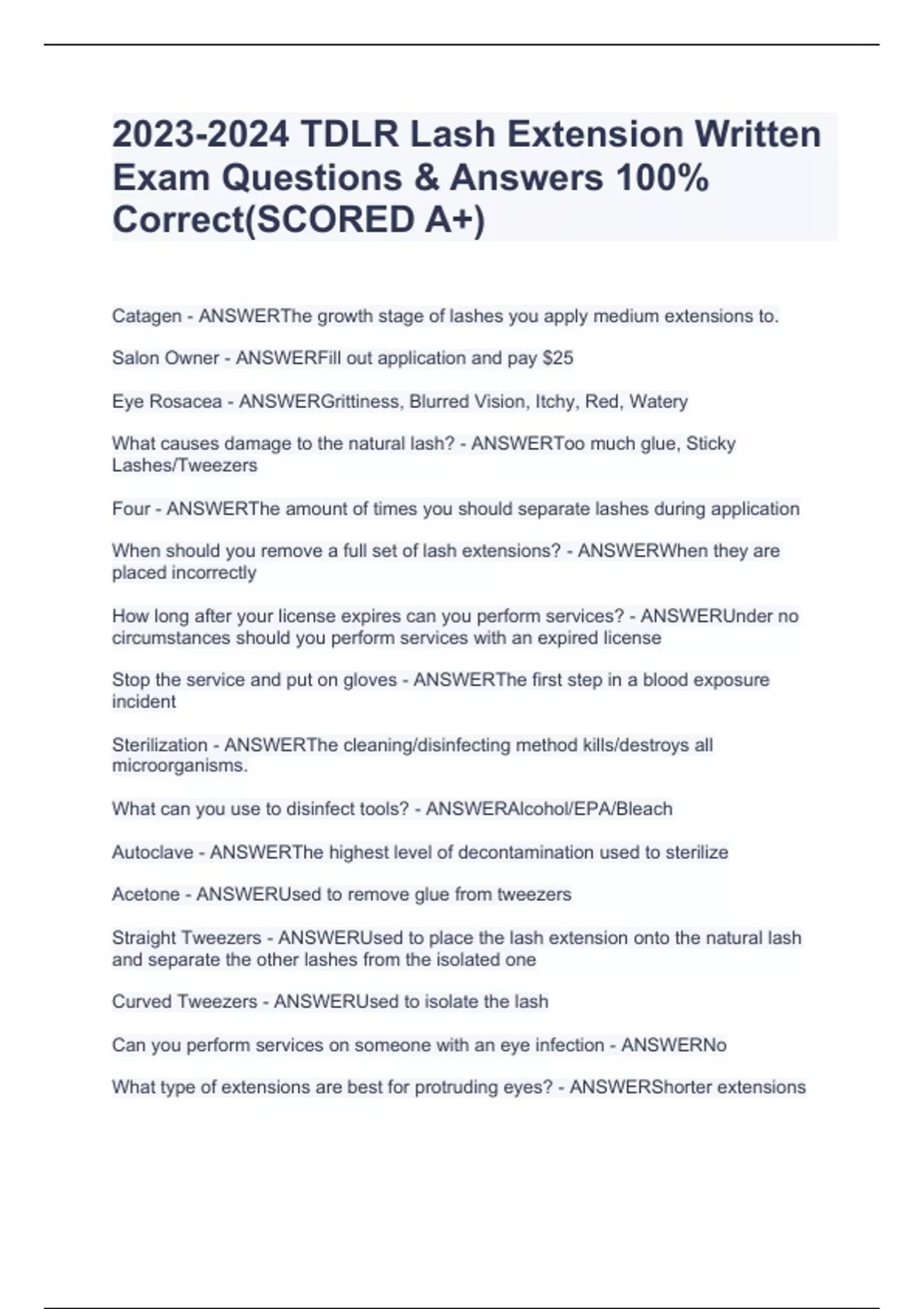 TDLR Lash Extension Written Exam Questions & Answers 100% Correct(SCORED A+)