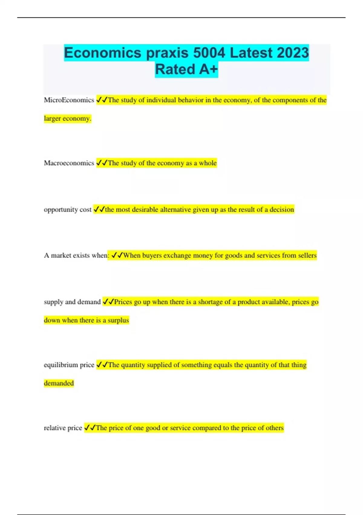 Economics praxis 5004 Latest 2023 Rated A+ MicroEconomics The study of individual behavior in the economy, of the components of the larger economy. Macroeconomics The study of the economy as a whole opportunity cost the most desirable alternative given up as the result of a decision A market exists when: When buyers exchange money for goods and services from sellers supply and demand Prices go up when there is a shortage of a product available, prices go down when there is a surplus equilibrium price The quantity supplied of something equals the quantity of that thing demanded relative price The price of one good or service compared to the price of others competition Lowers costs and prices and encourages producers to produce more of what consumers are willing and able to buy. Laissez-faire Idea that government should play as small a role as possible in economic affairs. Capital Accumulated money or goods available for use in producing more money or goods Capitalism An economic system based on private ownership of capital Communism Government owns all means of production and regulates the economy Socialism Government only owns the major means of production and attempts to equalize distribution of income mixed economy market-based economic system with limited government involvement deficit spending When a government spends more than it takes in and goes into debt. Fascism A totalitarian form of government where one person rules (dictatorship) Mercantilism belief in the benefits of profitable trading The Communist Manifesto Pamphlet written by Karl Marx and Friedrich Engels-basis of Socialism. free enterprise the opportunity to control one's own economic decisions conspicious consumption People buy useless goods to establish high social status Monopoly One person or company owns all of one good or service Oligopoly Small number of sellers dominate a market or industry Fiscal Policy Governments attempt to influence the economy through changes in taxes, or government spending Nonprofit Institutions Exempt from most taxes Corporations businesses that are owned by many investors who buy shares of stock Stock market A place where stocks are bought and sold Gross Domestic Product Measure of a nations economic output and income. The total market value of all goods and services produced in the economy for one year, divided by the number of people living in the country Inflation A rise in both pay and prices Tariff A tax on imported goods Quota a limitation on imports Imported To bring in goods from a foreign country for sale or use Human Resources Amount of human effort given to obtaining money natural resources materials found in nature that are used by living things (land, air, minerals) production use of resources to create goods and services interest rate The amount paid to borrow money Scarcity A situation in which unlimited wants exceed the limited resources available to fulfill those wants entrepreneur people who take on financial risk to make profits by producing goods free enterprise the opportunity to control one's own economic decisions The law of diminishing returns When the benefit is outweighed by the cost incentive something that induces a person to act Globalization All countries are intertwined in an economic way capital goods Buildings, machines, technology, and tools needed to produce goods and services.