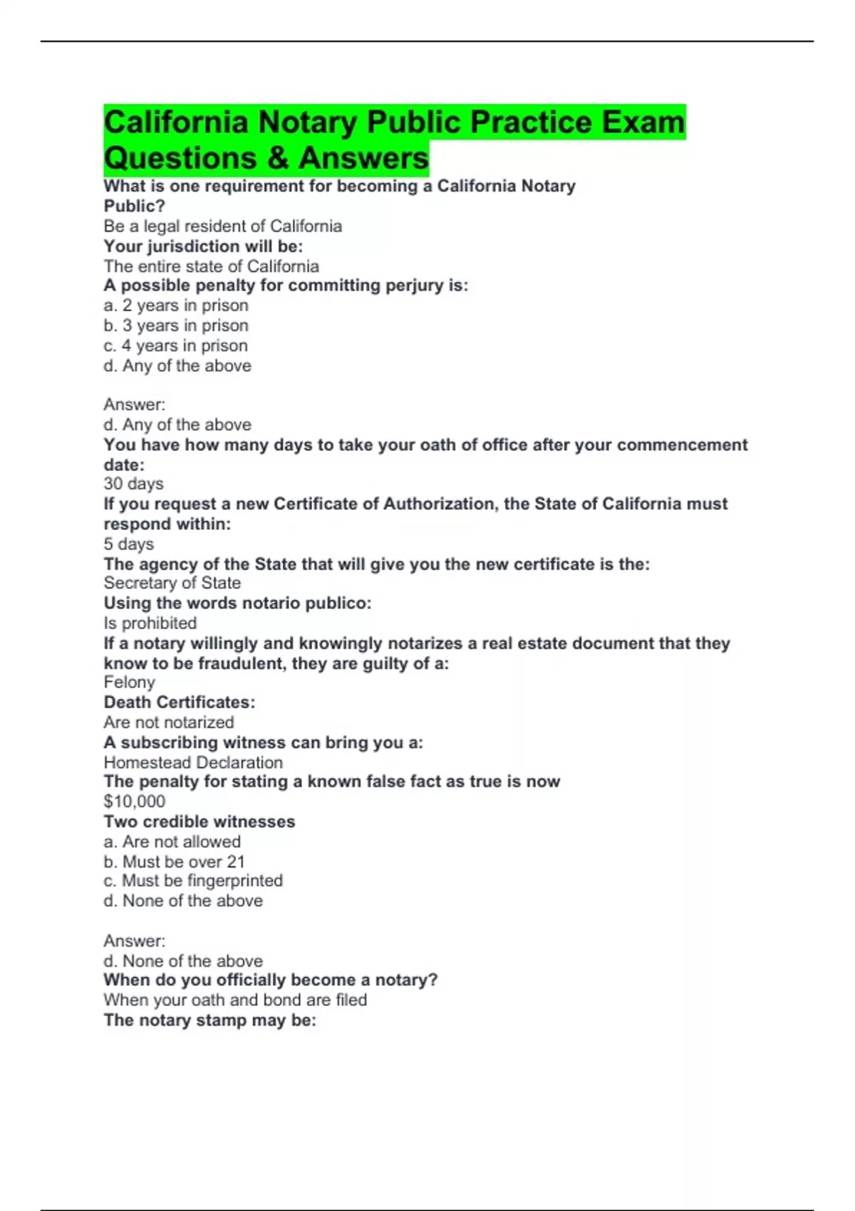 California Notary Public Practice Exam Questions & Answers What is one requirement for becoming a California Notary Public? Be a legal resident of California Your jurisdiction will be: The entire state of California A possible penalty for committing perjury is: a. 2 years in prison b. 3 years in prison c. 4 years in prison d. Any of the above Answer: d. Any of the above You have how many days to take your oath of office after your commencement date: 30 days If you request a new Certificate of Authorization, the State of California must respond within: 5 days The agency of the State that will give you the new certificate is the: Secretary of State Using the words notario publico: Is prohibited If a notary willingly and knowingly notarizes a real estate document that they know to be fraudulent, they are guilty of a: Felony Death Certificates: Are not notarized A subscribing witness can bring you a: Homestead Declaration The penalty for stating a known false fact as true is now $10,000 Two credible witnesses a. Are not allowed b. Must be over 21 c. Must be fingerprinted d. None of the above Answer: d. None of the above When do you officially become a notary? When your oath and bond are filed The notary stamp may be: