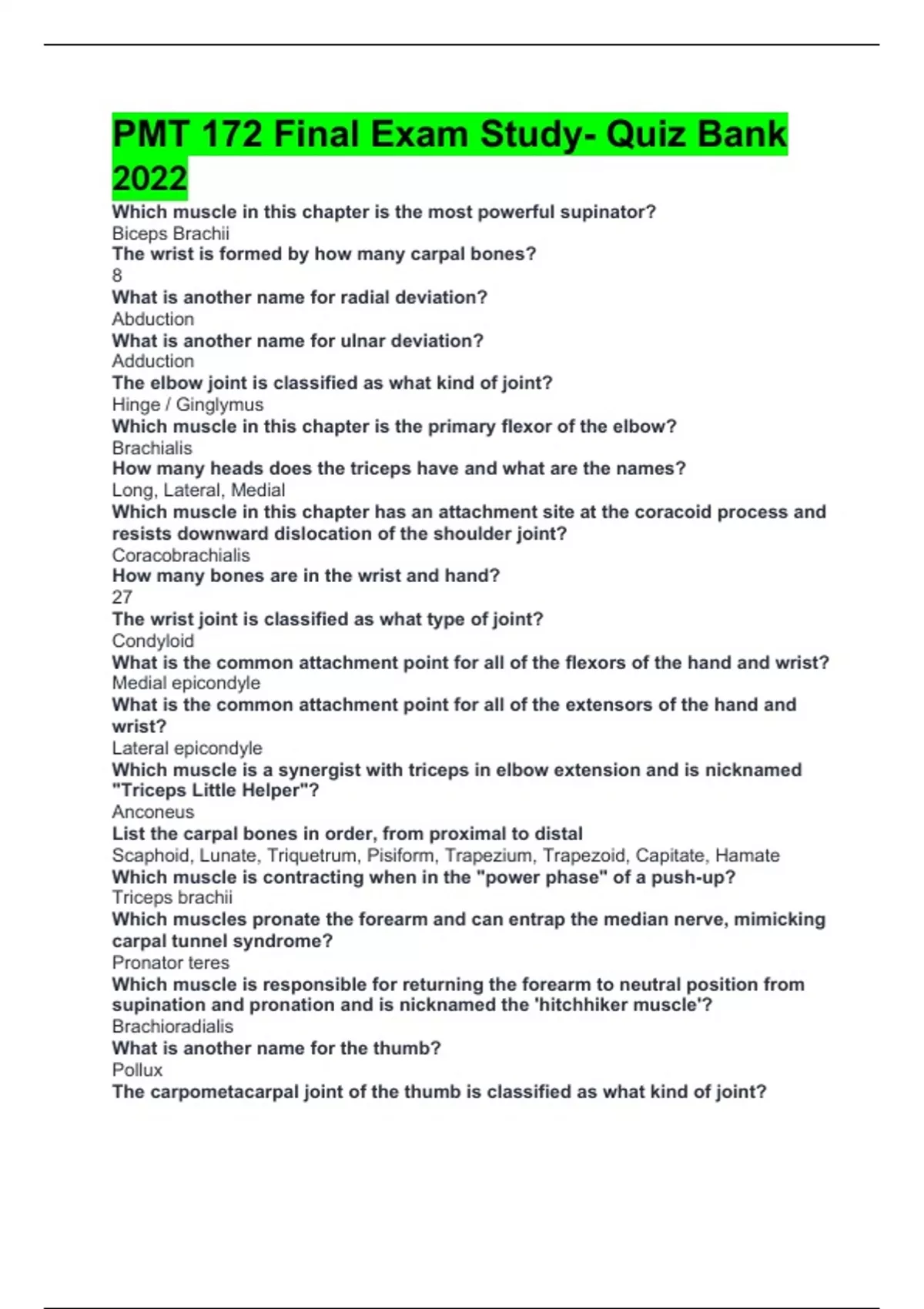 2022 Which muscle in this chapter is the most powerful supinator? Biceps Brachii The wrist is formed by how many carpal bones? 8 What is another name for radial deviation? Abduction What is another name for ulnar deviation? Adduction The elbow joint is classified as what kind of joint? Hinge / Ginglymus Which muscle in this chapter is the primary flexor of the elbow? Brachialis How many heads does the triceps have and what are the names? Long, Lateral, Medial Which muscle in this chapter has an attachment site at the coracoid process and resists downward dislocation of the shoulder joint? Coracobrachialis How many bones are in the wrist and hand? 27 The wrist joint is classified as what type of joint? Condyloid What is the common attachment point for all of the flexors of the hand and wrist? Medial epicondyle What is the common attachment point for all of the extensors of the hand and wrist? Lateral epicondyle Which muscle is a synergist with triceps in elbow extension and is nicknamed