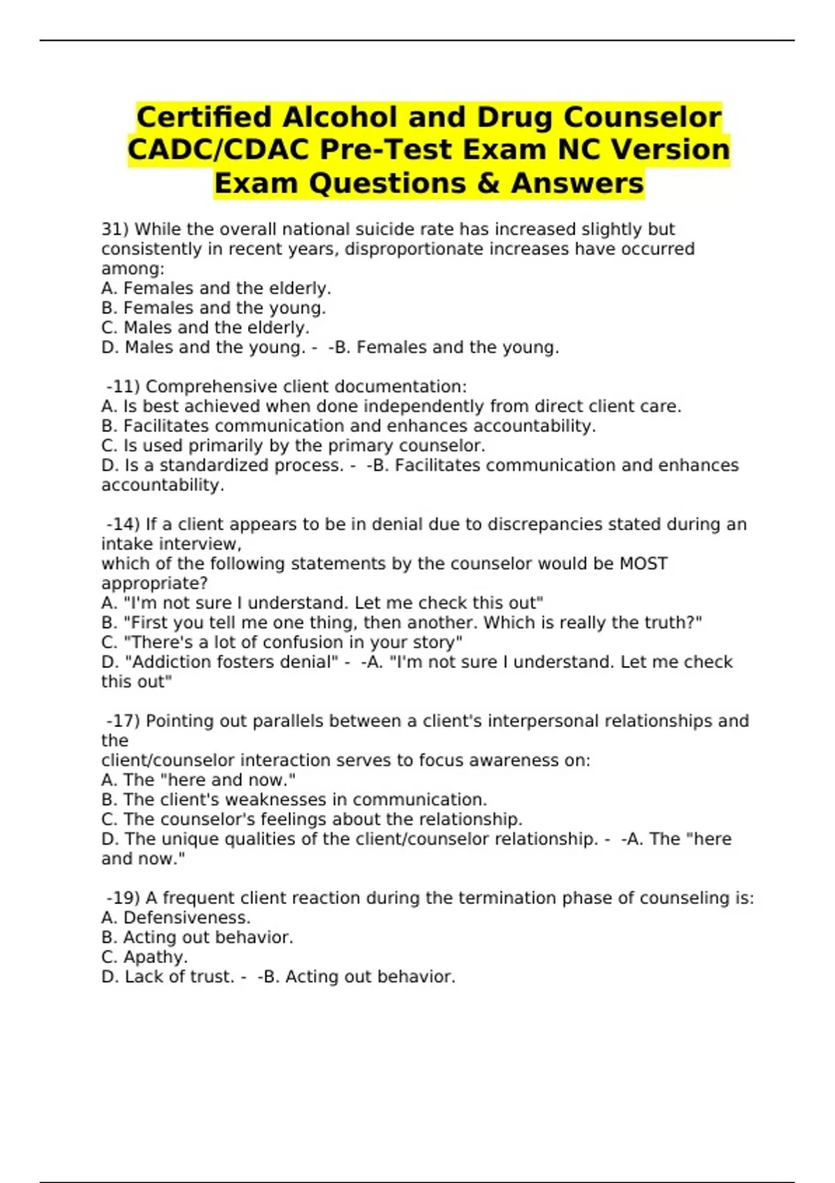 Certified Alcohol and Drug Counselor CADC/CDAC Pre-Test Exam NC Version Exam Questions & Answers